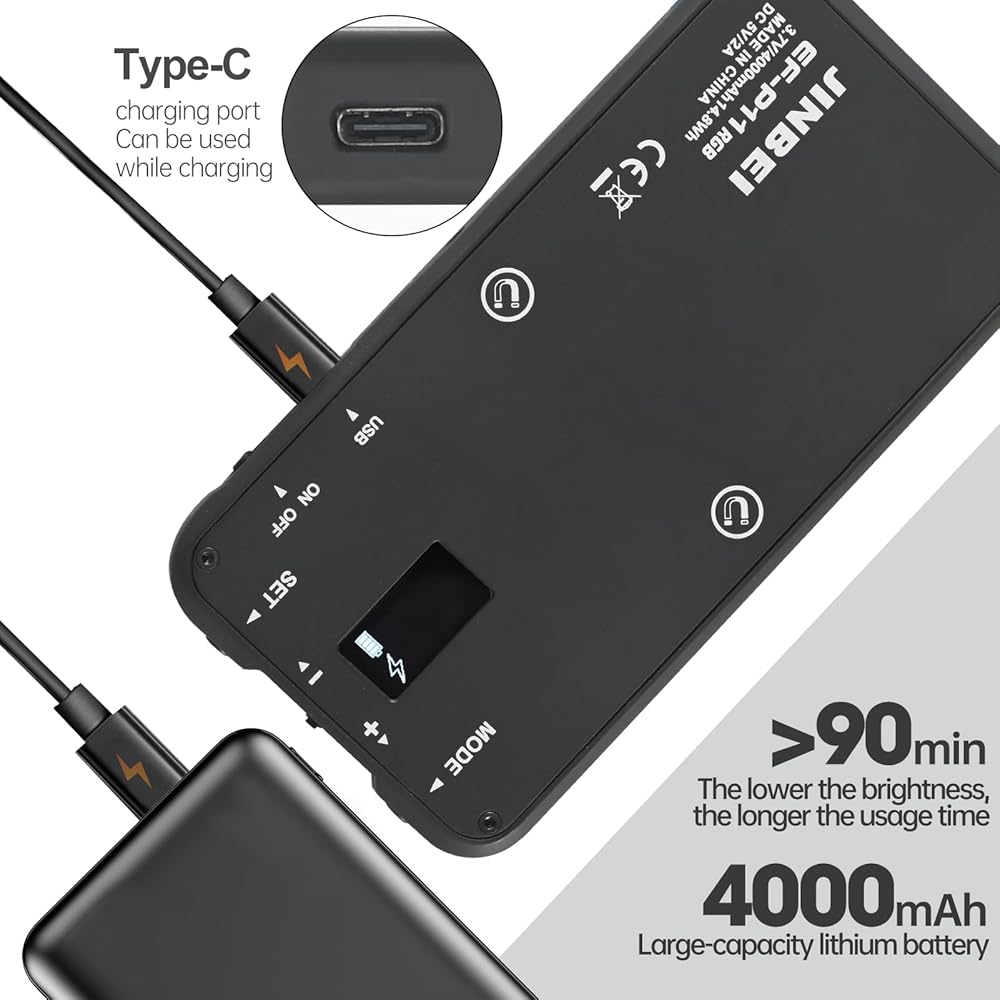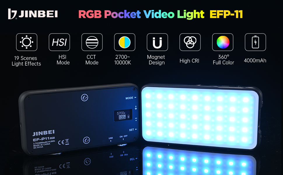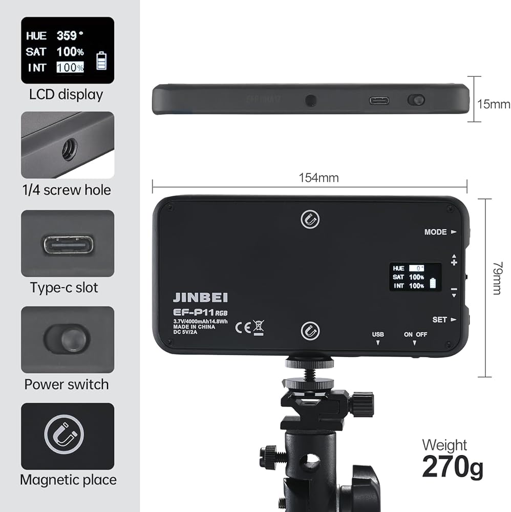 JINBEI EFP-11 Magnetic RGB Video Light Ra>96 TLCI≥98 2700~10000K Smartphone Control 360° Full Color On Camera LED Cold Shoe 4000mAh Rechargeable DSLR Lighting for Vlogging, Video Conference