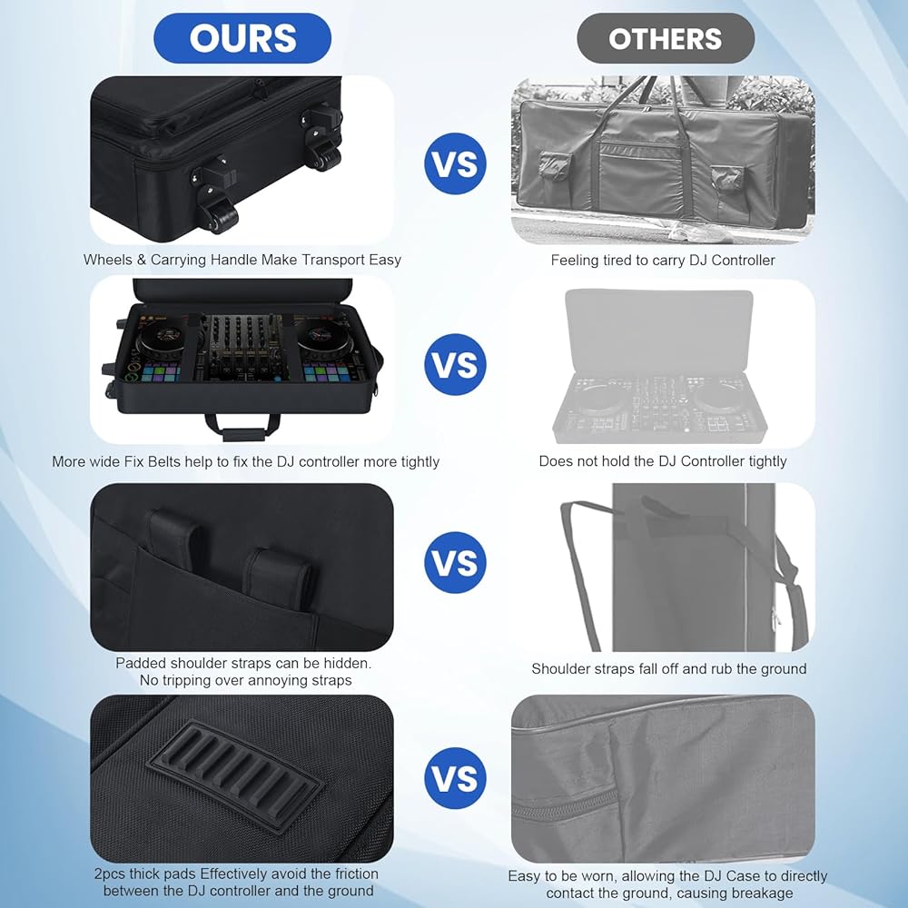 【Full Protection for DJ Equipment】The DJ Carrying Case is full padded with soft thick foam, which can protect your DJ controller and accessories from bumps, scratches or other damages while transport. 2 adjustable fix belts in the DJ Roller Bag are used to tight the dj controller, avoiding shaking and other damage during transport.
