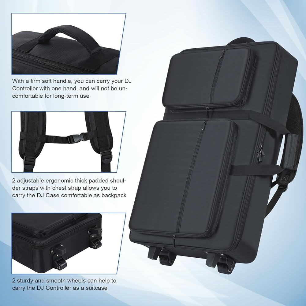 【3 Ways to Carry DJ Roller Bag 】The DJ Case offers Large wheels, shoulder strap, backpack straps, carrying-handle, top-handle. The DJ case comes with wheels and top-handles for easy portability; The shoulder strap is soft padded, adjustable and removeble; the backpack straps can be hidden; the carrying handle is padded and comfortable.