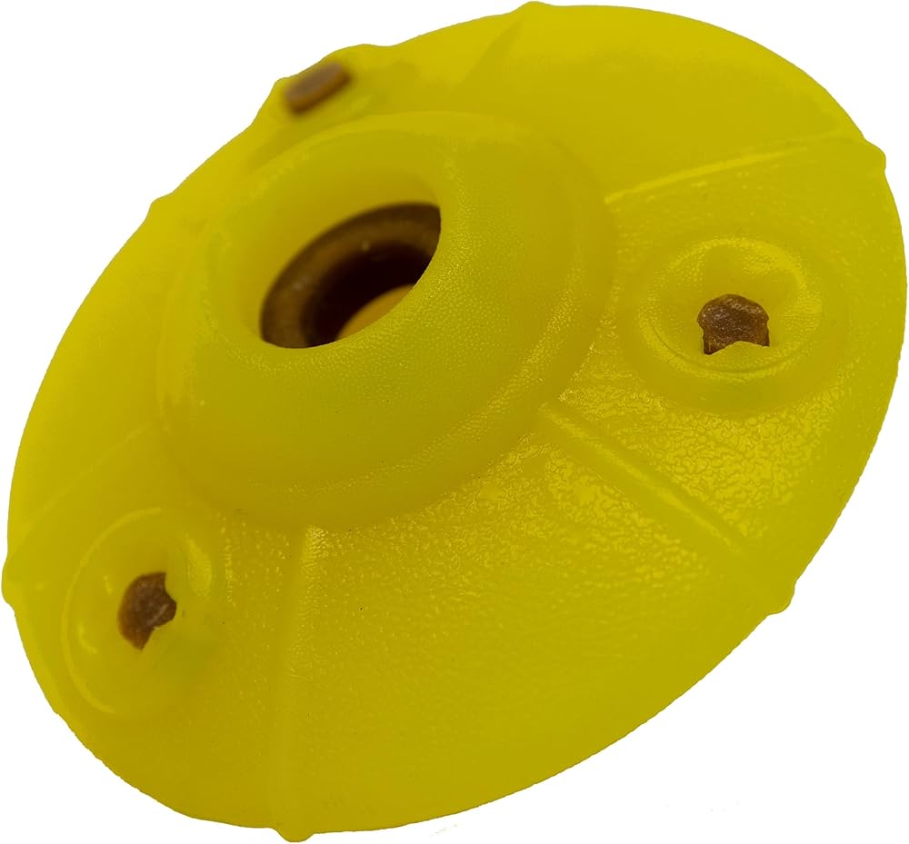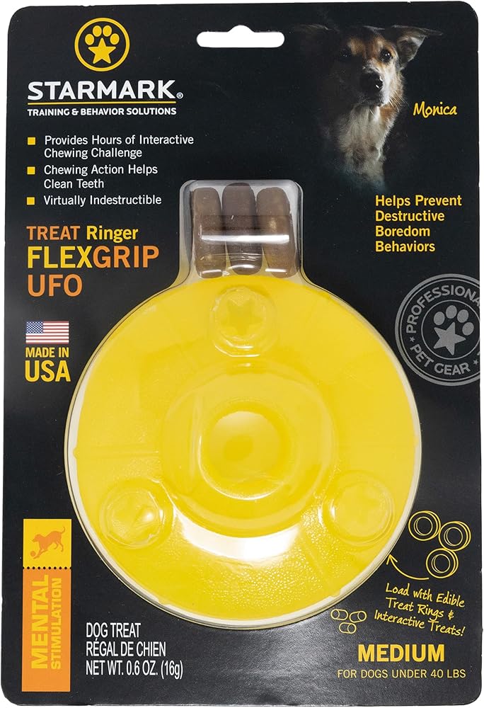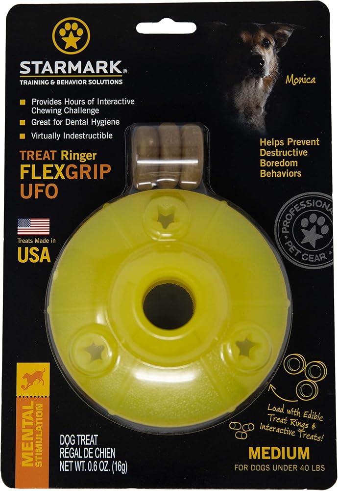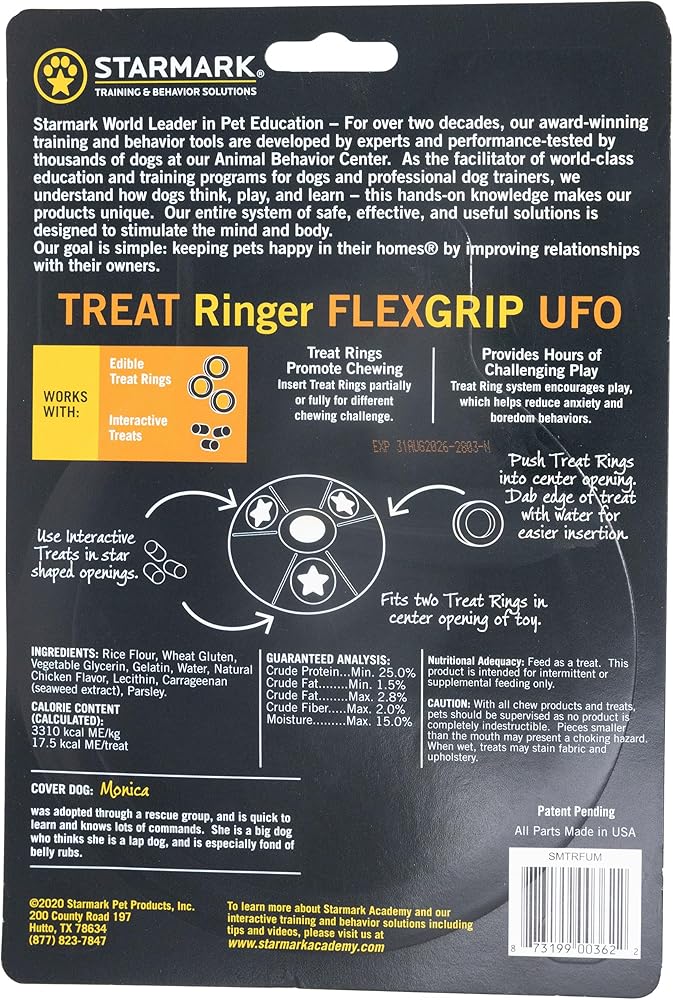 Starmark's FlexGrip UFO is a chewing challenge in the Treat Ringer line. Made from extremely durable, yet soft and flexible elastomer, these toys are dog tough for strong chewers. Comes packaged with USA-made Edible Treat Rings. Inserting Treat Rings partially helps dogs learn how to extract the treats, or insert fully for chewing experts. Toys are dishwasher safe for easy cleaning.