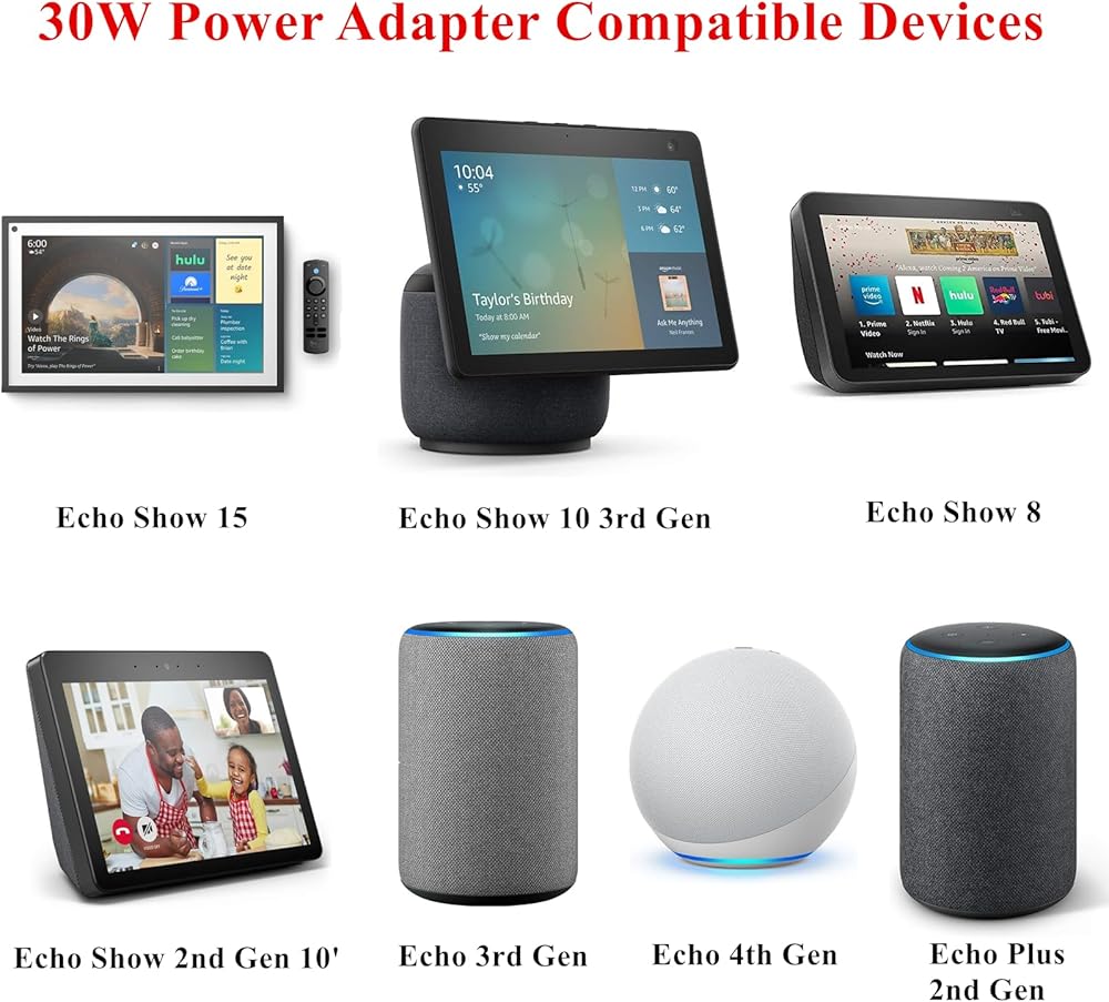30W Power Adapter for Echo Show 15,Echo Show 10 (2nd-3rd Gen),Echo Show 8(2nd-3rd Gen),Echo (3th/4th Gen),Echo Plus (2nd Gen),5Ft AC Adapter Power Cord