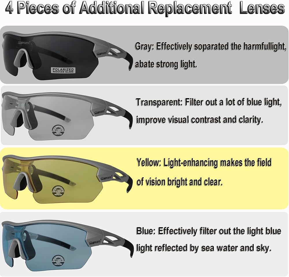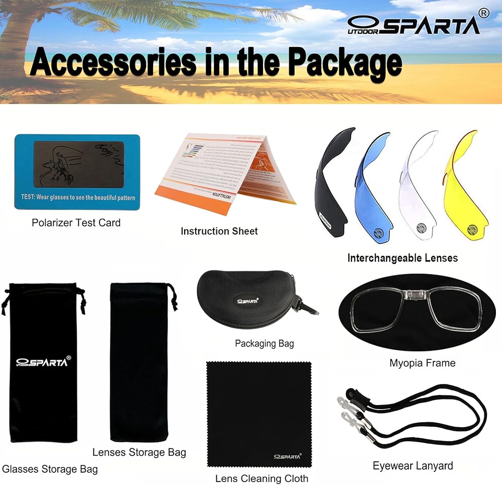 5. What you will got: 1×sunglasses, 2×micro-fiber bags(one is used for storing glasses and the other is for storing the lenses), 1×lens cleaning cloth, 1×instruction sheet, 5×replacement lens(1×Revo coated lens, 1×polarized TAC lens, 1×yellow lens, 1×clear lens, 1×blue lens ), 1×EVA bag, 1×polarized test paper, 1×frame for myopic lens.