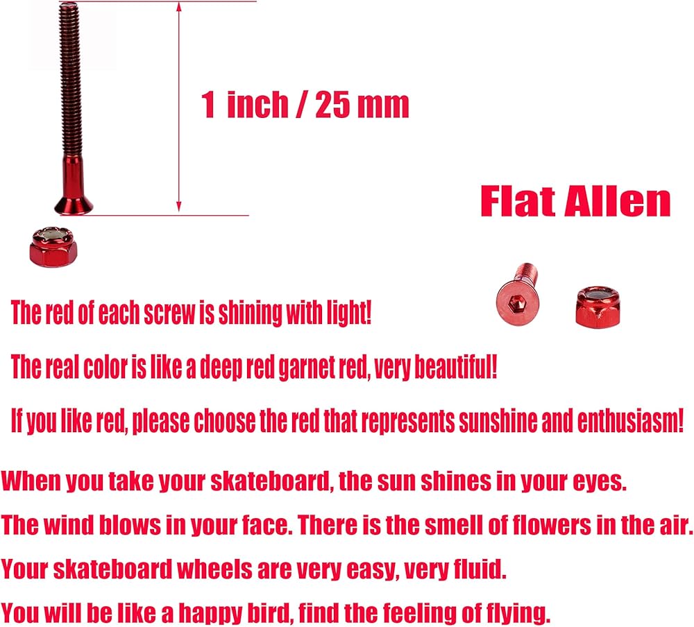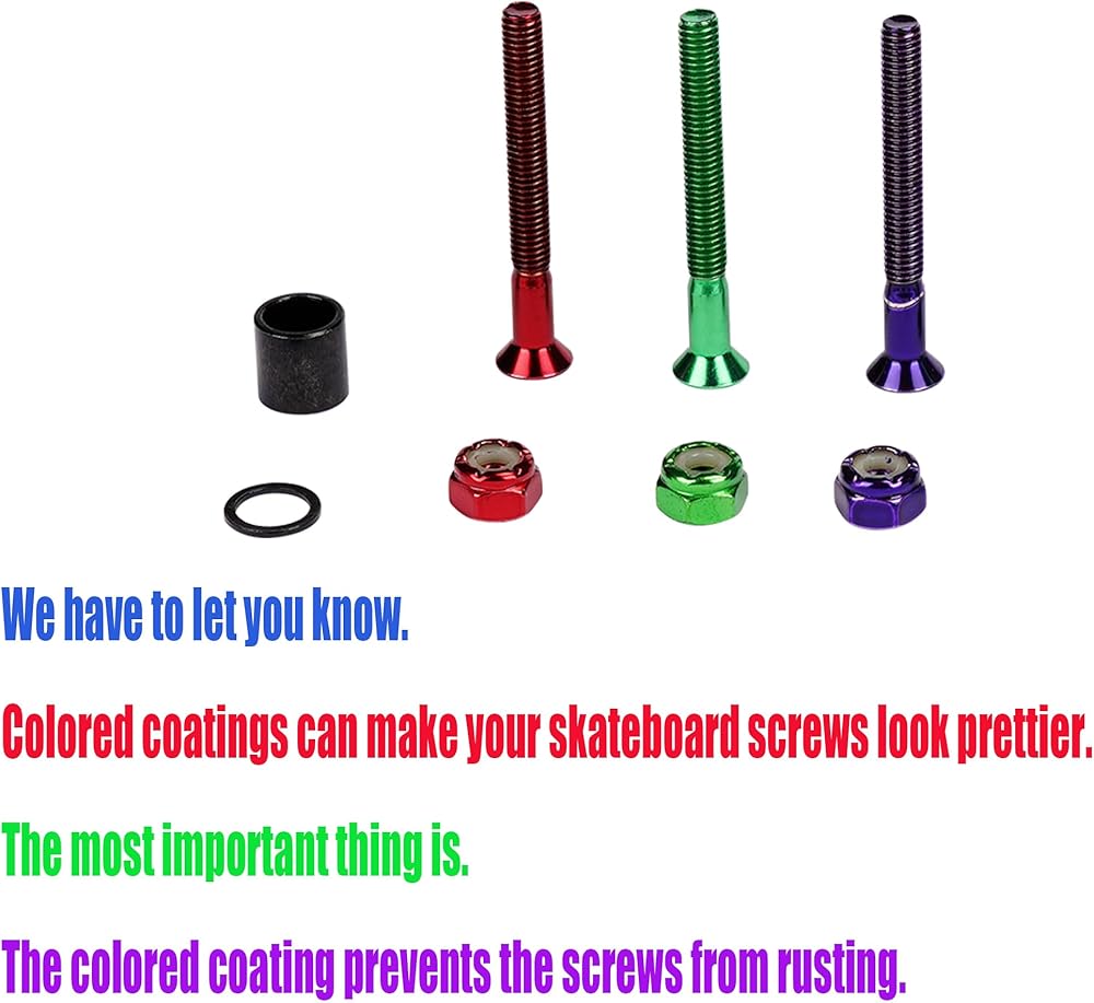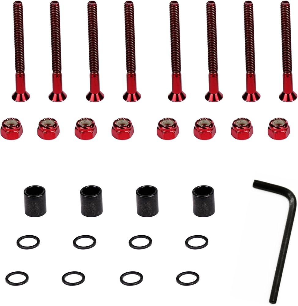 We offer Red skateboard hardware sets, you can choose your favorite colors, including red, purple, green. You need to choose different sizes, including 29MM .The package includes: you will get 8X Bolts, 8X Nuts 4X Skateboard Spacers 8X Skateboard Washers.