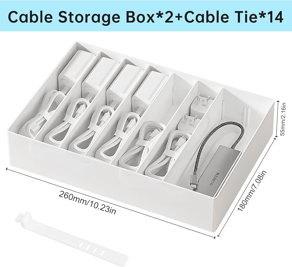 🏝️【Size and Services】Product size: Length 10.2 inch; Width 7 inch; Height 2.1 inch. (Package includes Cable Storage Box ×2+Cable Tie×14) If there is any problem with the product,please feel free to contact with us and we will get back to you within 24 hours and give you a satisfactory response.