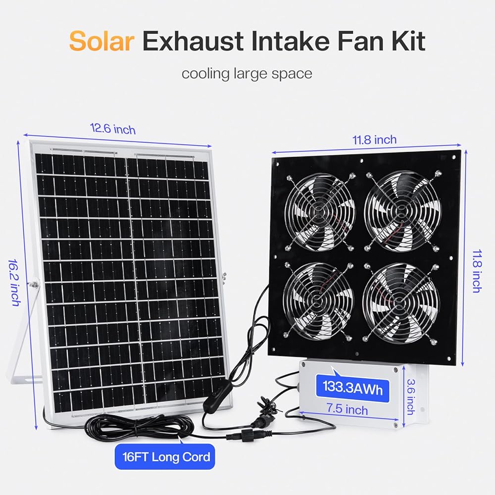 Solar Dual Fan Kit with 12000mAh Battery Backup, 25W Solar Panel Powered Rechargeable Fan for Chicken Coop, Greenhouse, Shed, Intake or Exhaust Air with IP67 Waterproof