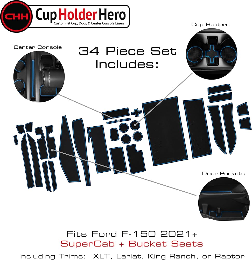 CupHolderHero Fits with Ford F150 Accessories 2021-2023 Premium Custom Interior Non-Slip Anti Dust Cup Holder Inserts, Center Console Mats, Door Pocket Liners 34pc Set (Bucket SuperCab) (Blue Trim)