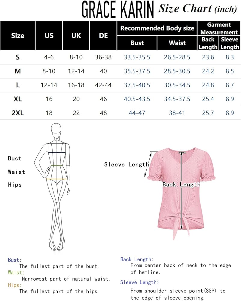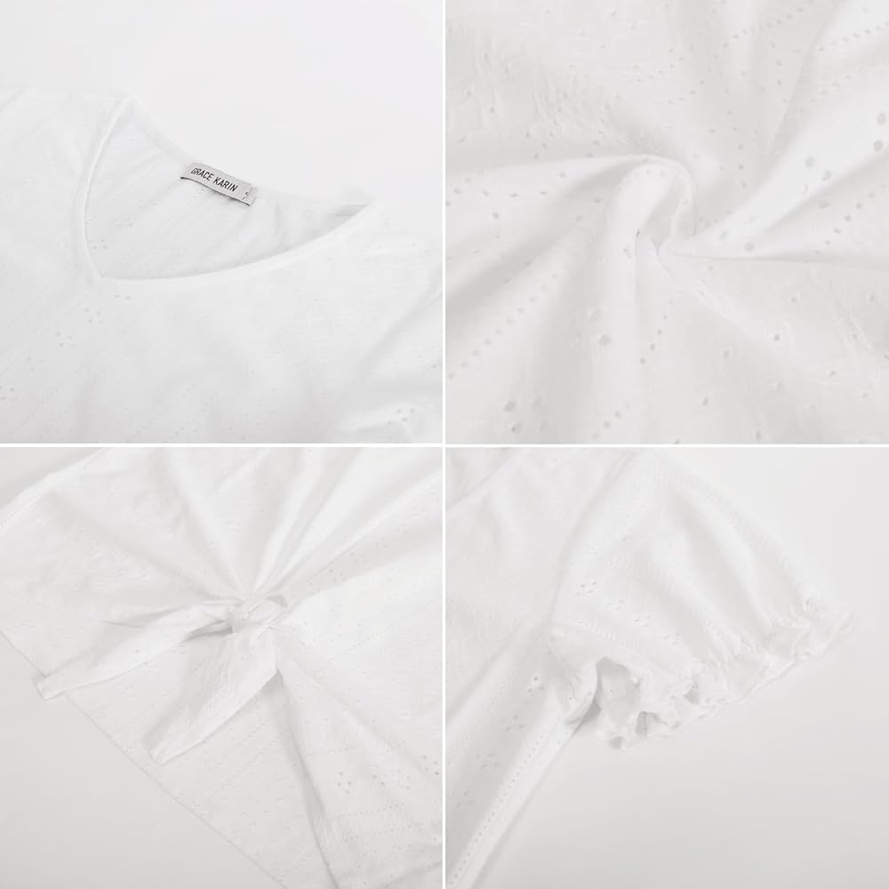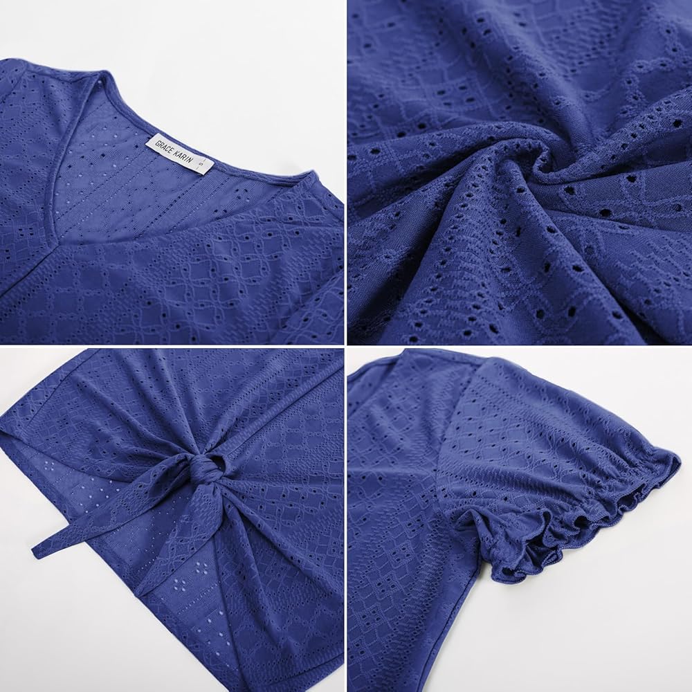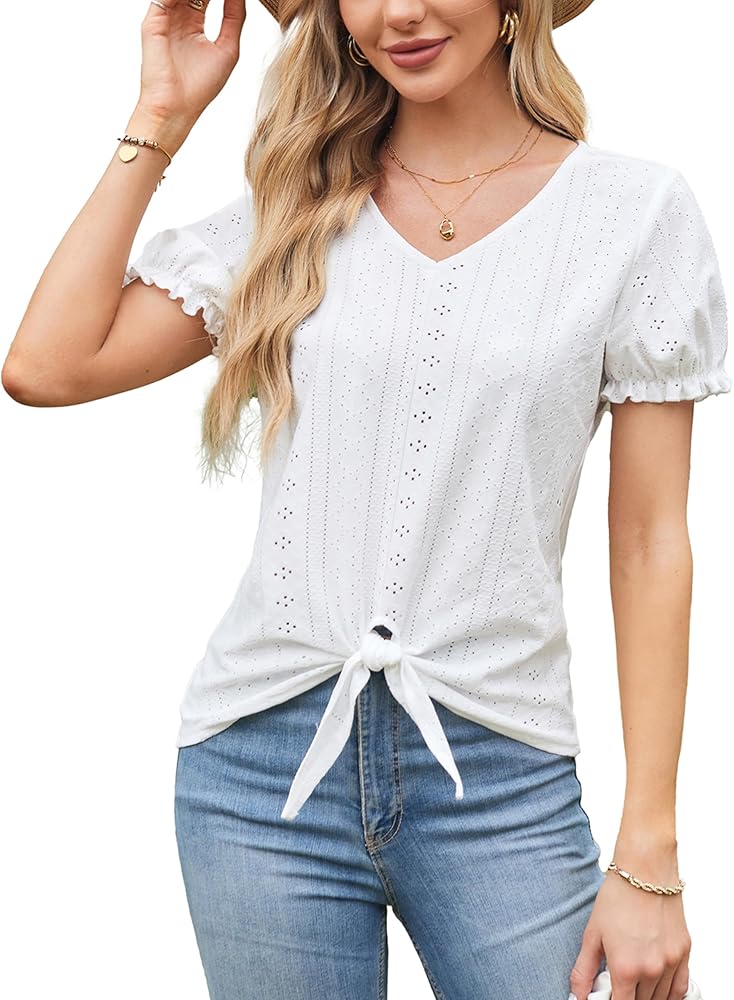 【Feature】Casual summer tops, v neck womens tops, puff short sleeve tops for women, tie knot front increase fashion and playfulness, loose fit, stretchy and breathable mataerial. Cute and Comfortable to wear.