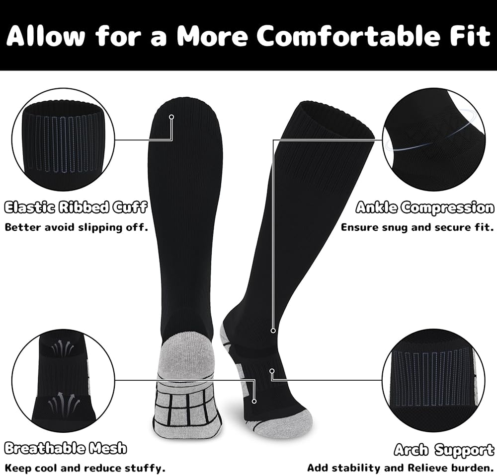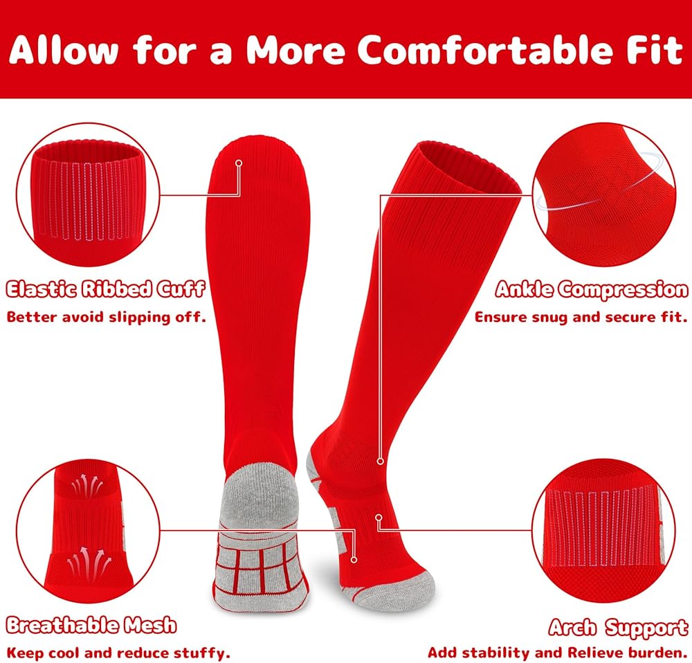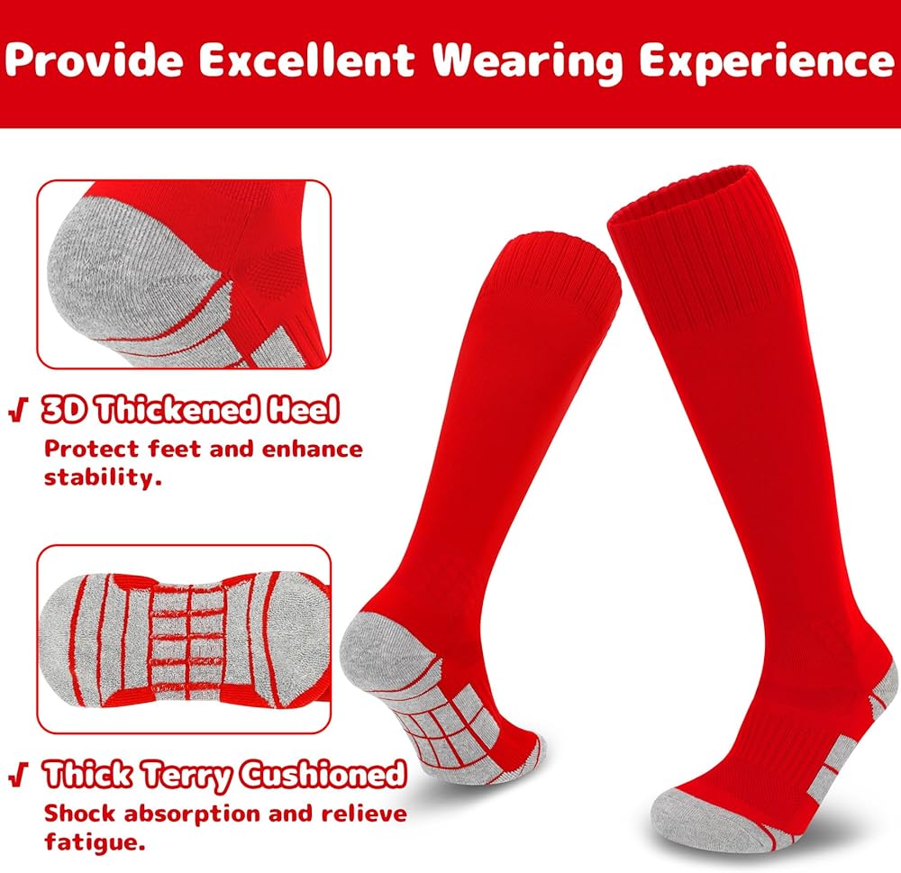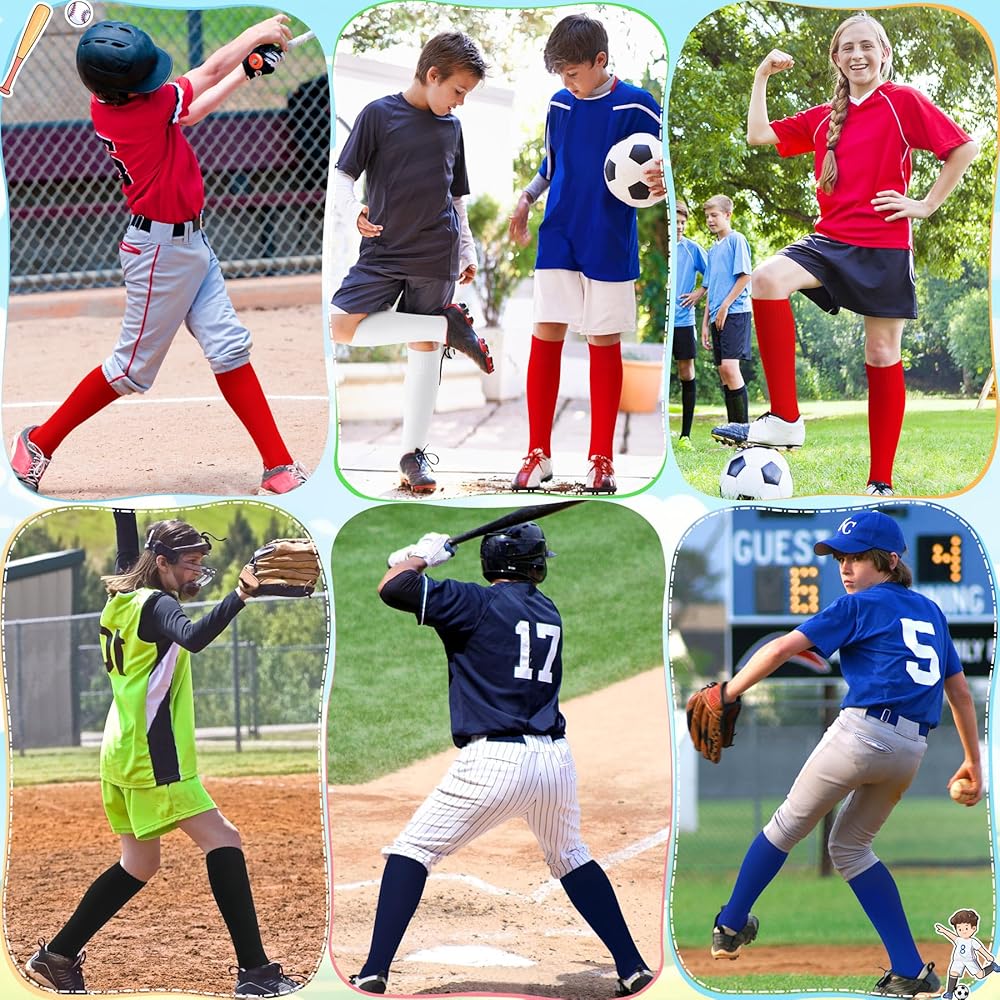 STRETCHY & DURABLE & MOISTURE WICKING: Our kids soccer socks are mainly made of premium polyester, which are super soft, skin-friendly and durable. Equipped with perfect elasticity, the youth softball socks make it easy to accommodate shin guards and ensure free movement on the sports field. Besides, the moisture wicking and sweat absorption functions of our youth baseball socks can effectively keep legs and feet dry and fresh, allowing for a more comfortable fit throughout the sports games.