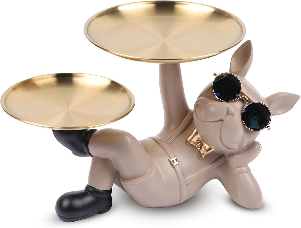 【Material and Function】The French Bulldog statue is made of high quality resin material, which is environmentally friendly and safe. Bulldog storage tray statue provides two metal trays that can be used as an exclusive space for personal storage, the trays are not easy to rust, not easy to break, can hold keys, watches, jewelry, cosmetics, candy and other small objects, can make the original cluttered desktop become more neat and tidy.
