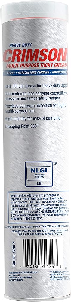 Valvoline's CRIMSON™ Grease (Red Lithium 12-Hydroxy) is a tacky, extreme pressure, lithium soap grease designed specifically for the commercial fleet environment. Formulated to stand up to a range of extreme operating environments & conditions. CRIMSON Grease provides excellent pump ability, lubrication and protection while withstanding extreme temperatures and load stresses, and deliver outstanding resistance to water washout.