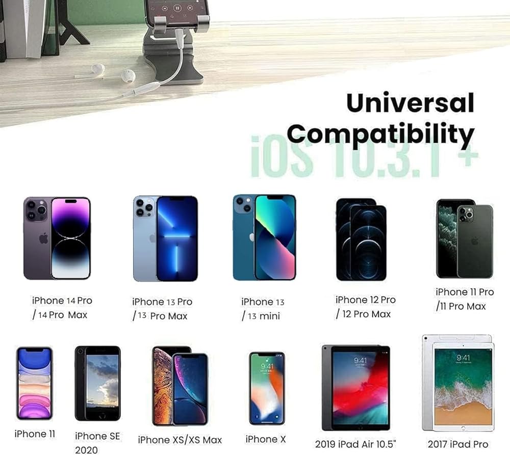 • 【Universal Compatibility】This apple lightning to 3.5 mm headphones jack adapter is particularly designed for iPhone lovers, compatible with iPhone 14/14 Plus/14 Pro/14 Pro Max/13/13 Mini/13 Pro/13 Pro Max/12/12 Mini/12 Pro/12 Pro Max/11/11 Pro/11 Pro Max/XS/XS Max/XR/X/8/8 Plus/7/7 Plus/6s/6s Plus/6/6 Plus/SE 2020/SE/5 and all iOS systems. This iPhone adapter can be used with any 3.5mm jack accessory. Integrated into the smart chip, you don't have to worry about system updates.