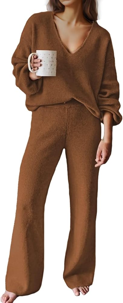 Women's Two Piece Outfits Sweater Sets Long Sleeve Knit Pullover and Wide Leg Pants Lounge Sets