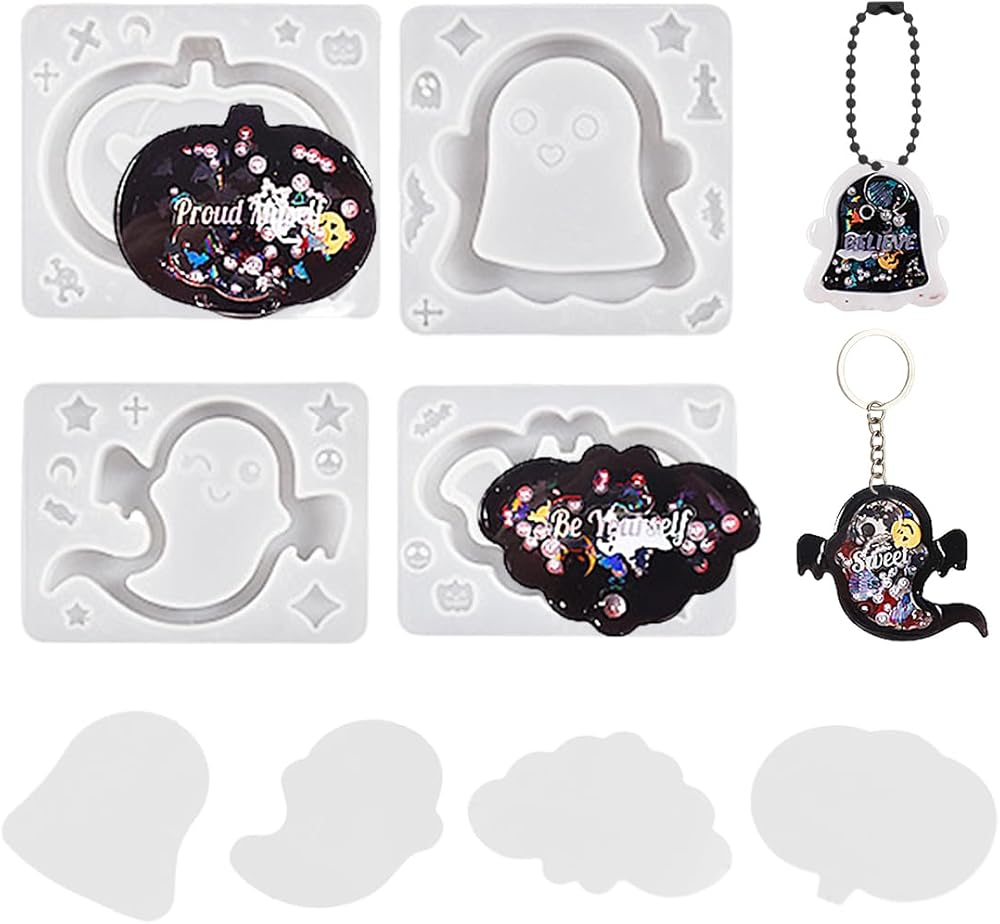 Voyyphixa 4 PCS Halloween Quicksand Silicone Mold with Seal Film Pumpkin Bat Ghost Resin Molds Horror Ornament Epoxy Casting Molds for Keyring Pendants Jewelry Making (Halloween Mold B)