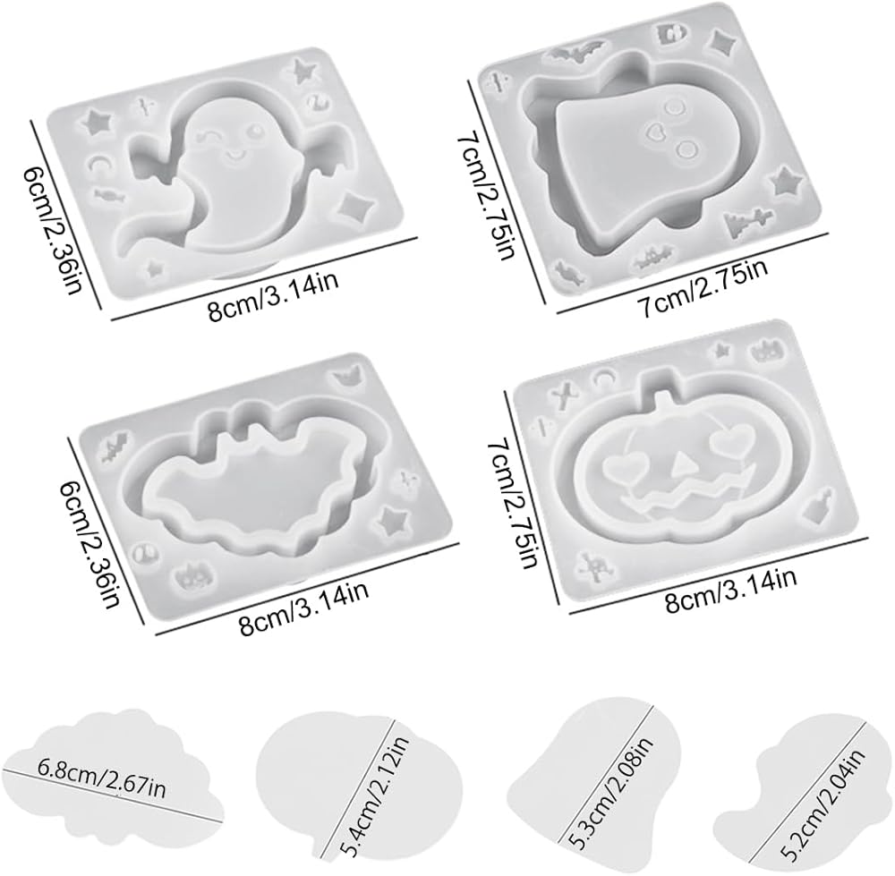 Halloween Resin Shaker Molds: The package includes 4 Pcs quicksand silicone molds with seal film. Ghost A mold is approx.8*6*1.1cm, ghost B mold is approx.7*7*1.1cm, bat mold is approx.8*6*1.1cm, pumpkin mold is approx.8*7*1.1cm.