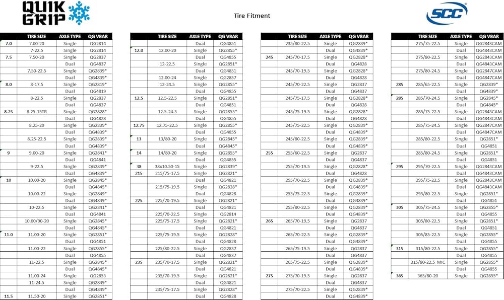 Security Chain Company's Quik Grip V-Bar chains feature a small 'V' of low carbon steel material is welded onto each link for added traction and durability. CAMs are also featured and are pieces of stamped steel that are placed on the outside rail of the tire chain. The keyhole on the CAM allows a tool to be inserted and turned, which takes up slack in the chain.