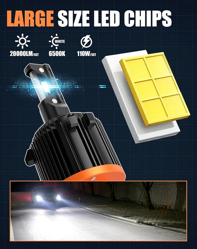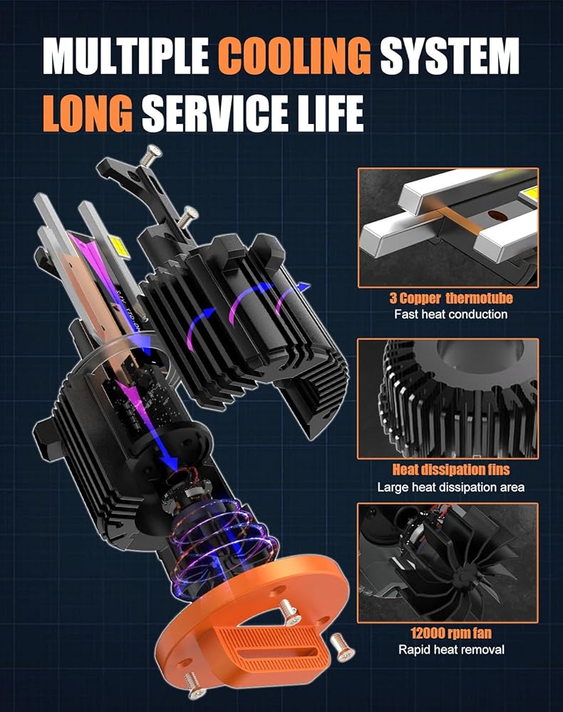 ☀ Long Lifespan☀ LED bulbs generate a lot of heat when working, which seriously reduces the life and brightness of LED bulbs. So heat dissipation and radiator are very important. Please do not buy LED bulbs without radiator. This H15 LED bulb uses multiple cooling designs: Pure copper substrate for super fast heat transfer. High-speed, large-blade fan for rapid heat removal. Large finned radiator at the tail, large cooling area.