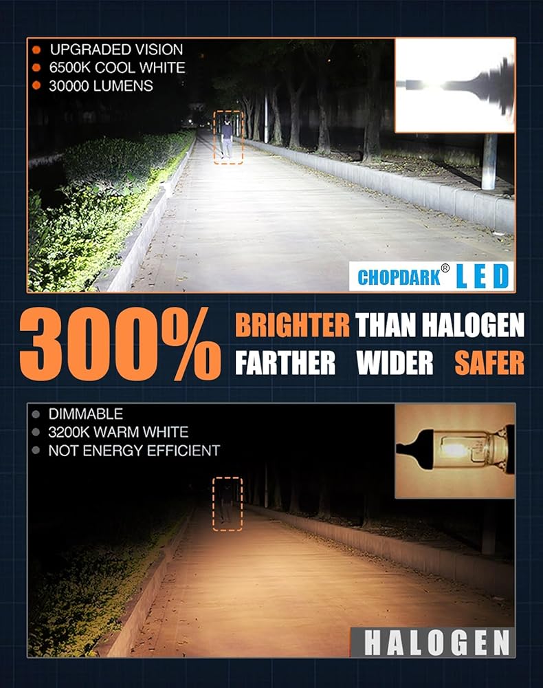 ☀Super Bright☀ This H15 LED Bulbs Daytime Running Light Using the latest 2*8 Big Size LED chips, 2-Side light, High-power 70W (35W/bulb), High brightness 30000Lm (15000Lm/bulb), 6500K Cool White Light. Brighter brightness, higher light efficiency, larger density and more uniform color. Bright but will not dazzle the other driver. Lights type standard, safe driving.