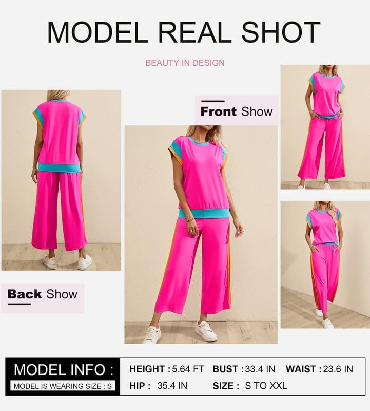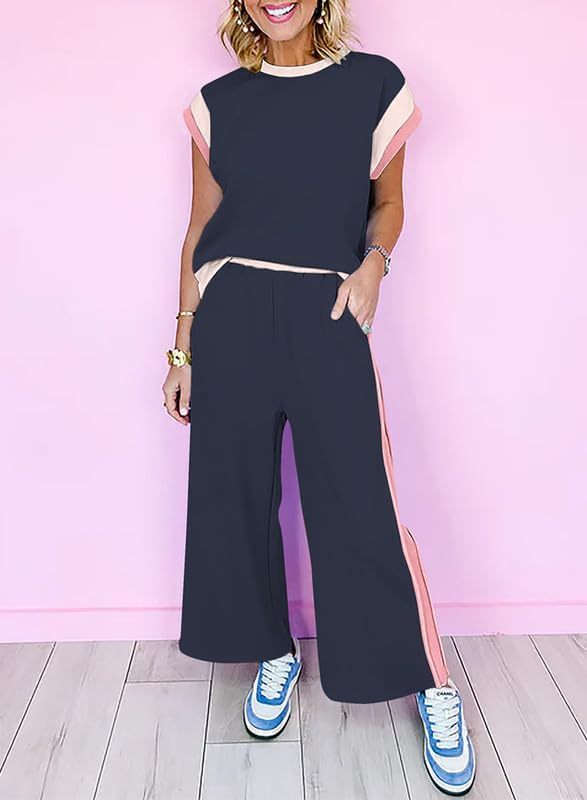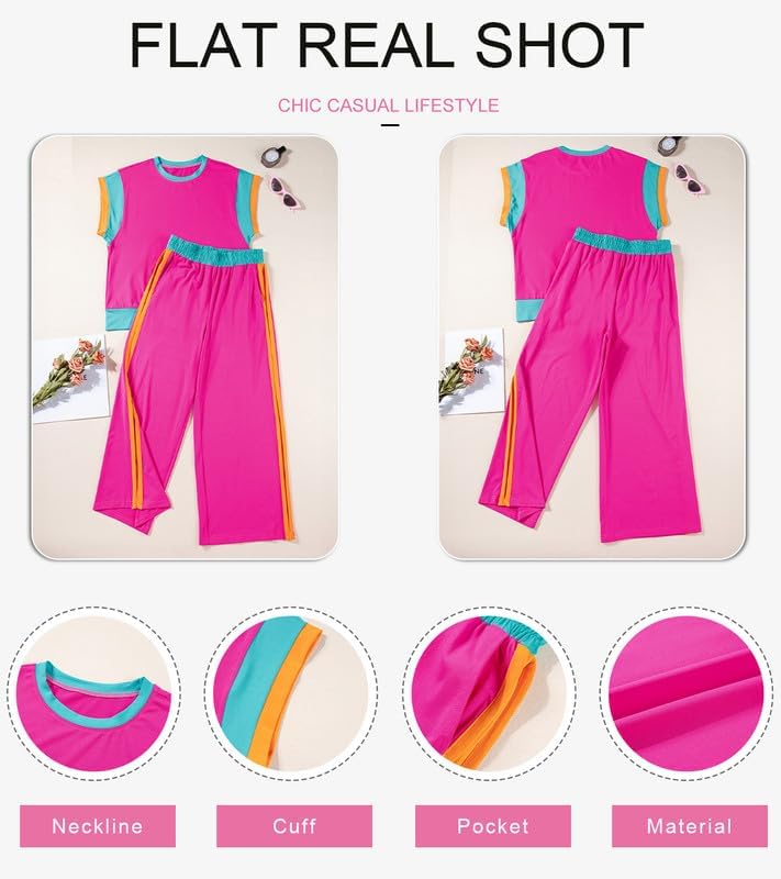 Feature: Two piece Oufits, Lounge Sets, Tracksuit Set, Crewneck, Color block, short sleeve pullover top, pants with wide leg, two pockets, and oversized loose fitting, create a relaxed and slouchy silhouette. This outfit is a versatile addition to your wardrobe.