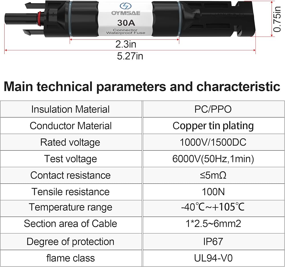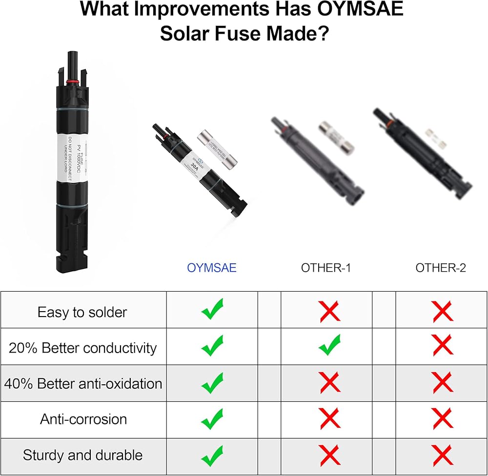 【High-Quality Material】The Solar Fuse is wrapped with a high-quality insulating PC/PPO shell, ensuring a reliable inline solar fuse lower than 5mΩ resistance and UL94-V0 flame resistance, It's worth mentioning that, due to the material upgrade, the temperature range of OYMSAE solar fuse can withstand higher temperature differences than other solar fuses temperatures from -40° ~ +105°, quality reliability.