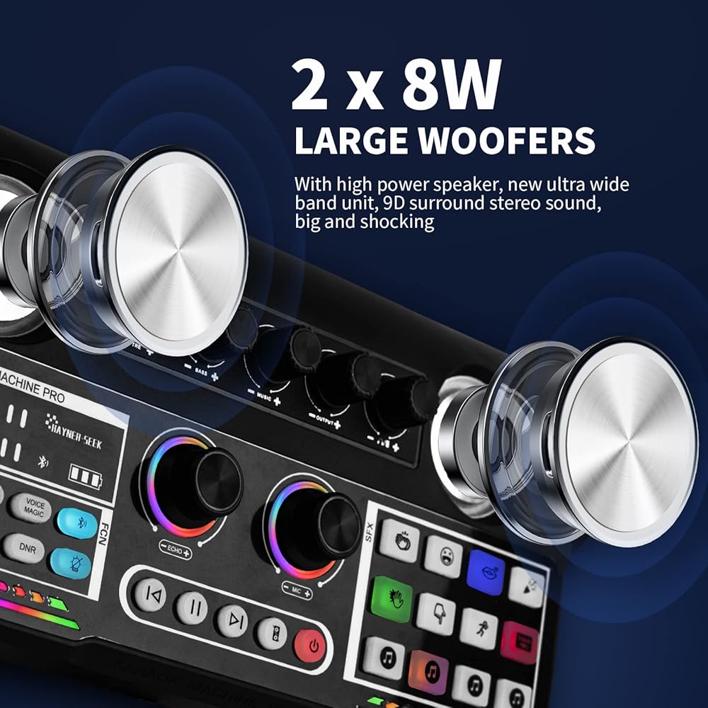 【BUILT-IN AUTO TUNE】The Karaoke machine for adults is an innovative singing machine, it is built-in the professional audio interface, it support 18 sound modes, 12 sound effects and side chain, loop back, music only useful online live functions. Also you can adjust treble, bass, echo manually. The device supplies multi tools. It will set off waves of cheers at your party/singing performance.