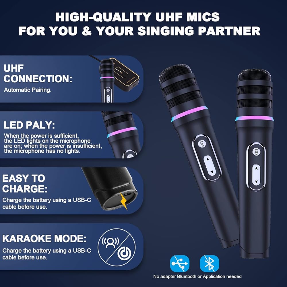 【PACKAGE CONTENTS】 Karaoke Machine Pro*1,Wireless microphone *2, UHF-Receiver *1, Audio cable *1, USB-C cable *2, C-C Cable*1, User manual *1. If you have any questions, please contact customer service 1 to 1 support, we are very honored to serve you.