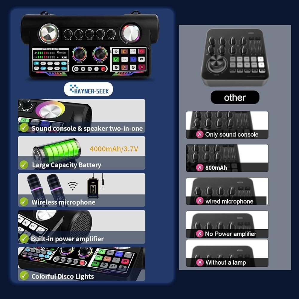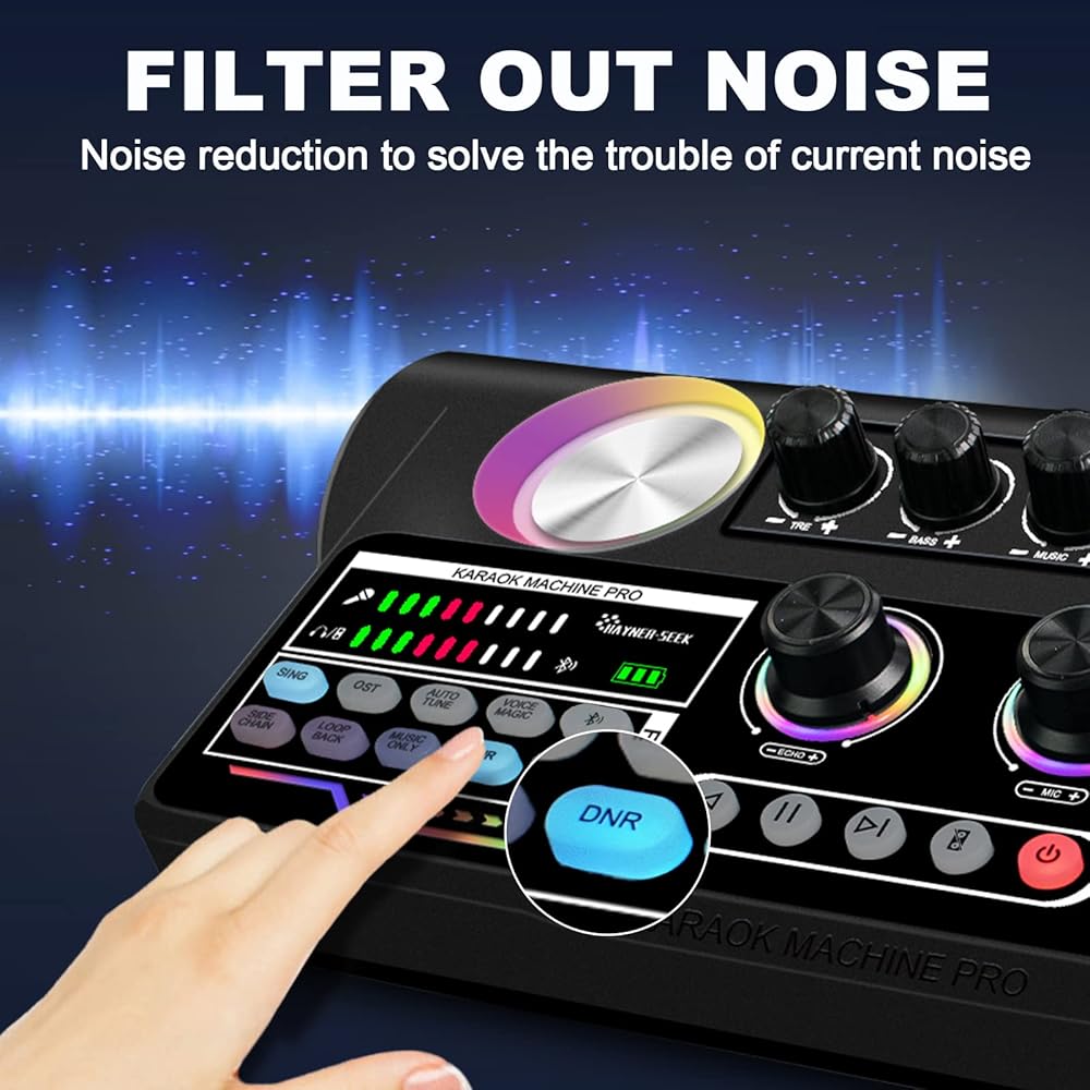 【NOISE REDUCTION & WIRELESS CONNECTION】 The karaoke machine has 10 functions such as noise reduction and wireless connection. It adopts dual-core DSP chip, and also has 4 voice-changers, 12 kinds of special sound effects and. Our two-in-one device has all the basic features a sound card should have.