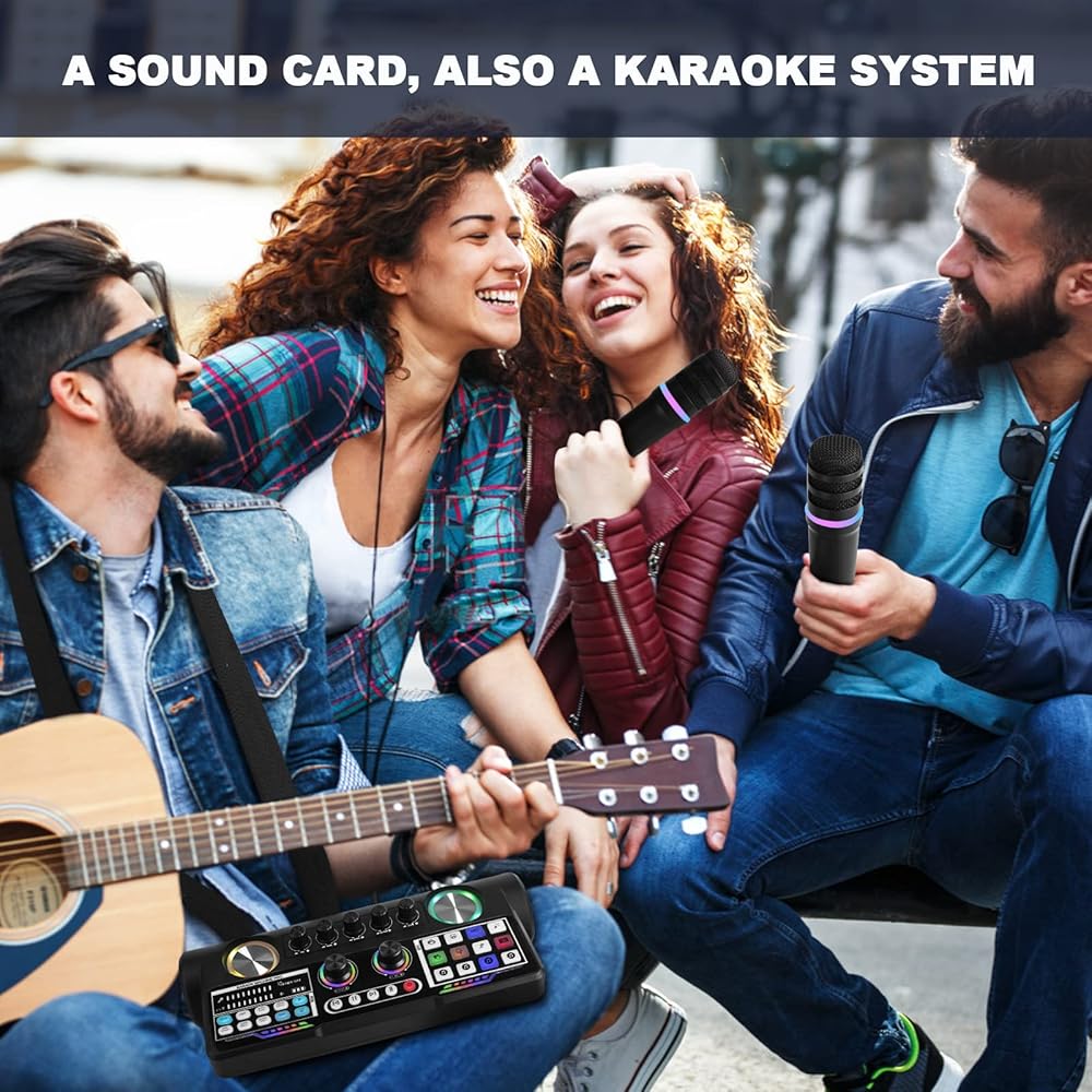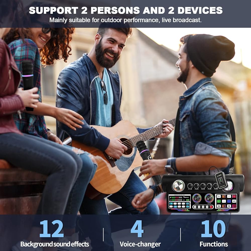 【MULTI FUNCTIONAL KARAOKE SYSTEM】This is a new design for the market, combining the sound card and karaoke speaker, equipped with two wireless karaoke microphones, is good for indoor/outdoor parties and live streaming. This karaoke machine is built-in audio interface and sound box is 1+1>2 design, outdoor singing or performance, you do not need to carry a heavy stereo, just need to put this device on the body, you can live anytime and anywhere.