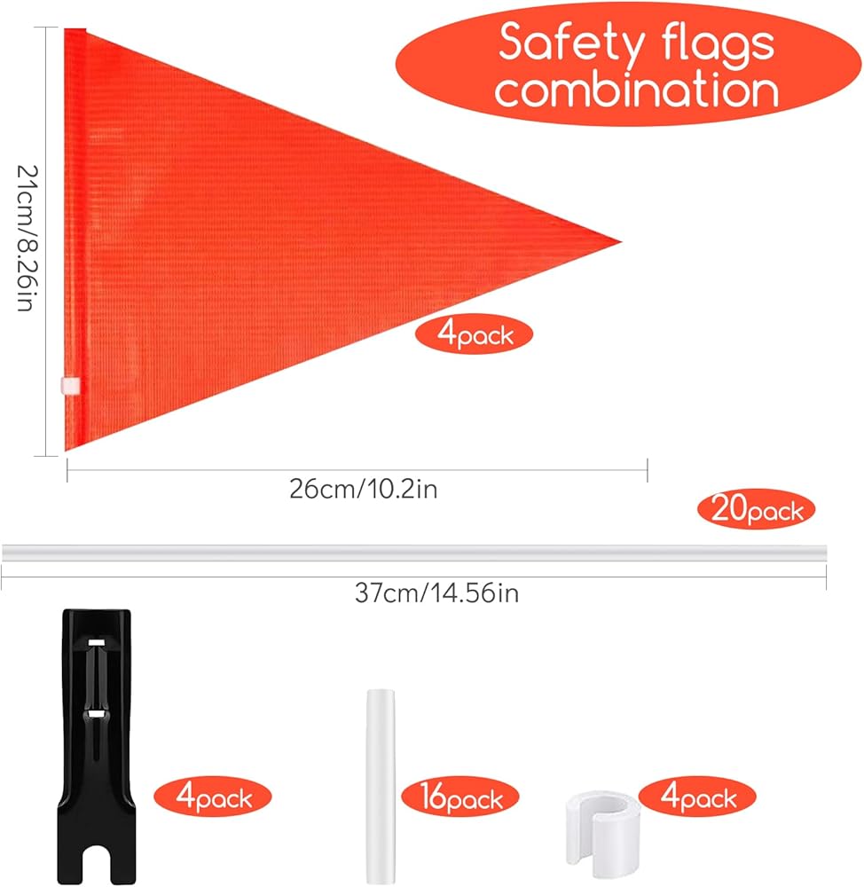 Easy to install:The package includes comes with mounting brackets and flagpole connectors that can be easily installed on the rear axle of the bike.Package includes: 4 bike flags, 4 buckles, 4 mounting brackets, 20 flagpoles and 16 flagpole connectors.