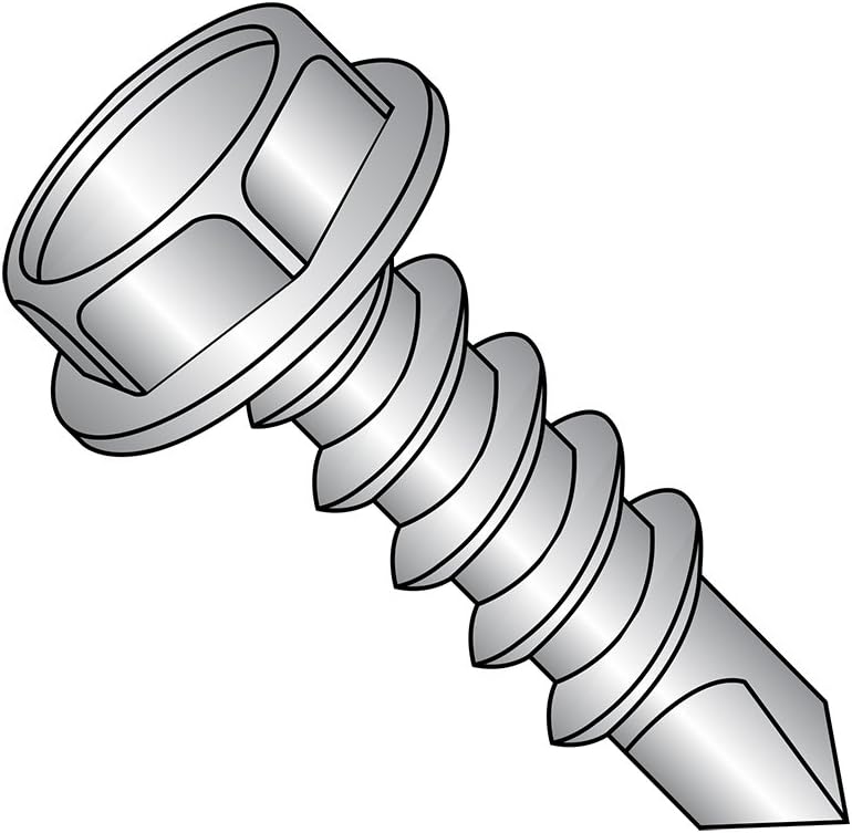 The 410 stainless steel self-drilling screw with plain finish has a hex washer head and a hex drive. The 410 stainless steel material offers high strength and hardness ratings, and resists corrosion in mild environments. The material is magnetic. The hex washer head has six flat sides that wrenches can grip to turn from the side, enabling use when there is no space above the head for a screwdriver. The flange acts like a washer to increase the fastener's bearing surface and distribute the clamping force over a larger area, providing grip and reducing damage to mating surfaces.