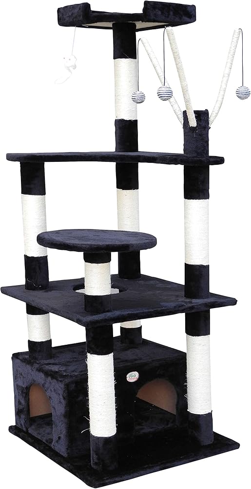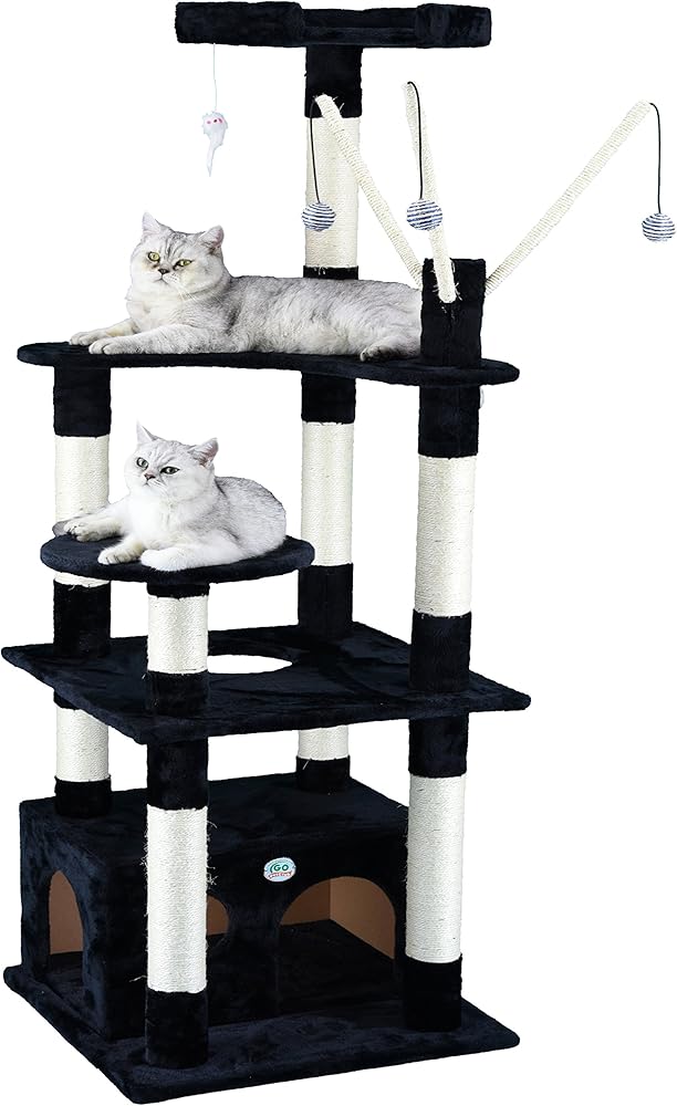 RELAXATION AND FUN: High perches are the perfect place for jumping and climbing, sisal wrapped scratching posts give your kitten hours of claw fun, large center condo provide calm and fun space for hiding out and napping, complete with hanging toys for batting, biting and swatting, this is the ultimate kitty paradise.