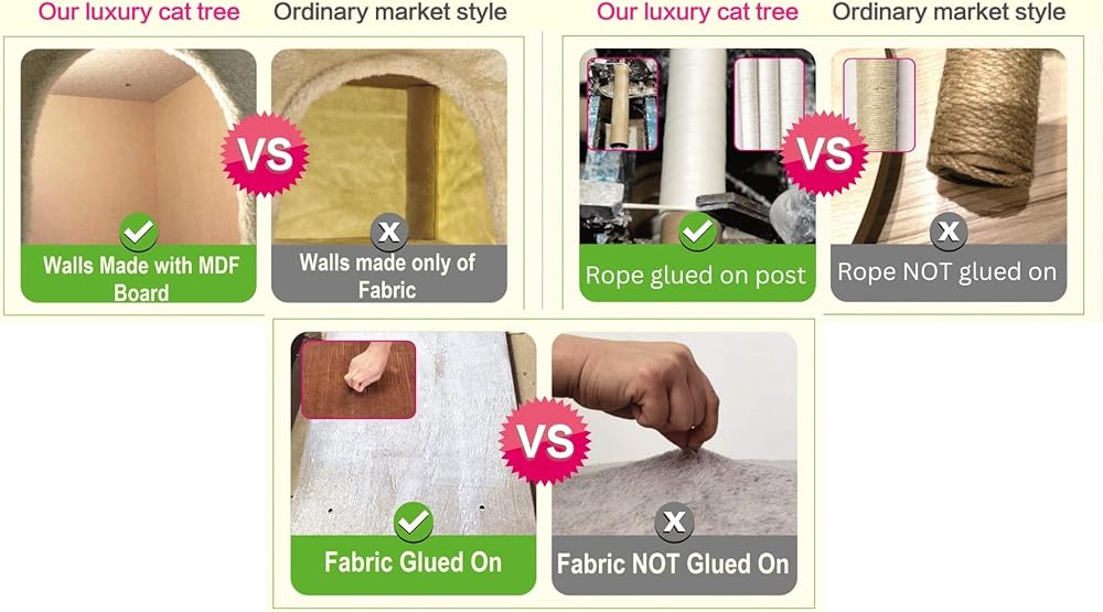 ULTRA-DURABLE: All scratching poles and boards are hand-glued with thick natural sisal ropes and skin friendly plushy faux-fur fabrics, strong enough to hold up against even the most aggressive scratchers, condo walls build with MDF board holds the shape of the cat tree, your investment will last a long time.