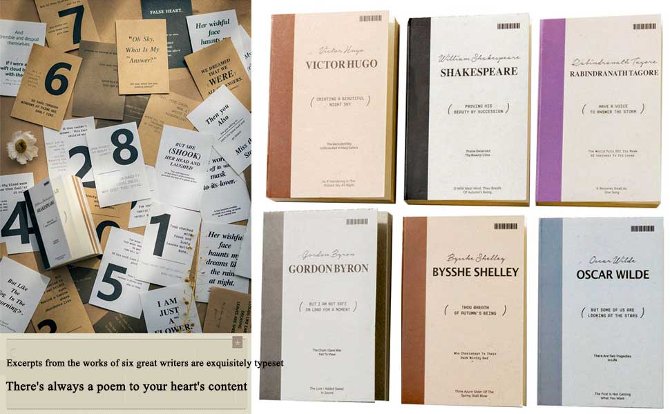 Excellent Quality - Our collection is beautifully typeset with excerpts from six great writers, ready to be torn off and used at your leisure. Each piece is perfectly suited for hand cutting and ensures smooth writing. Thanks to our high-precision printing inks, every pattern is vivid and clear. There's always a poem that speaks directly to your heart.