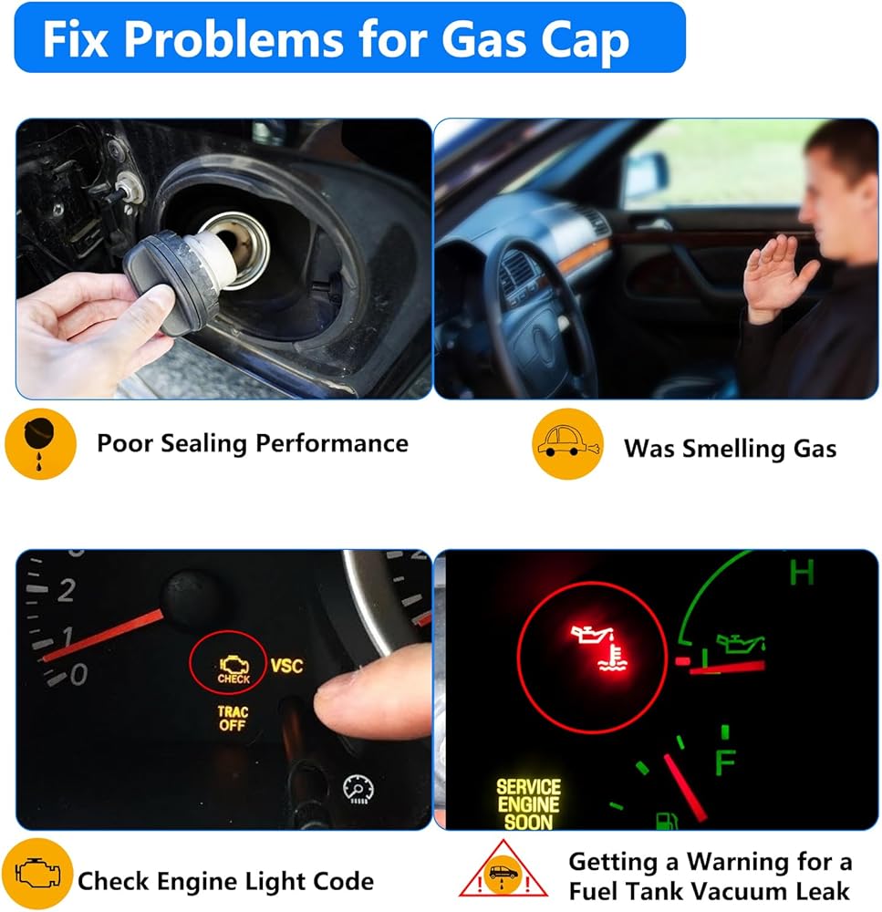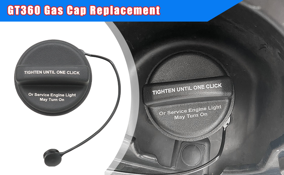 【Replacement Part Number】GT360 22921365 Gas Caps. Most fuel caps are sealed by turning them until you hear a clicking sound! It's time to check and replace your gas cap if you have the following troubles: 1. Your check engine light CEL turns on because of an old, loose, cracked or faulty gas cap. 2. If you smell of gasoline or diesel vapors around or near the fuel filler cap and your car is not smoking or making a unusual noise, please take a minute to check the gas cap.