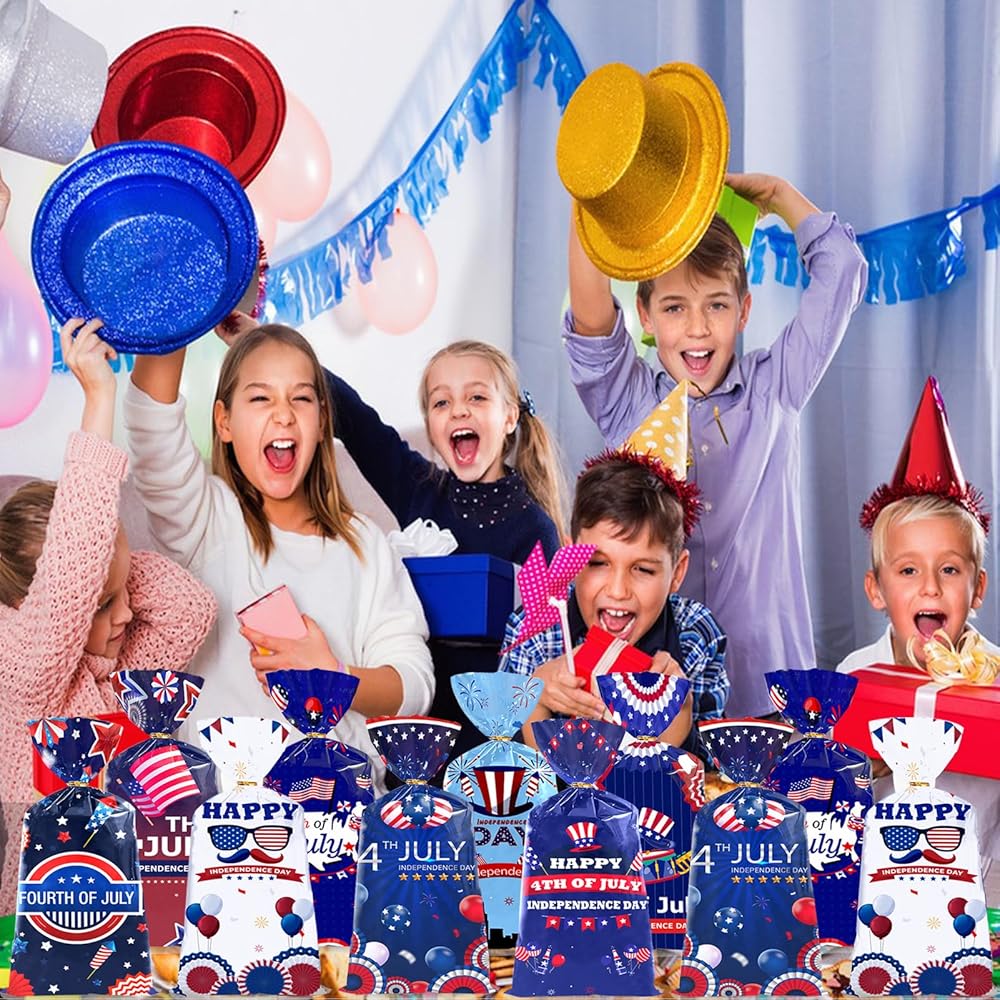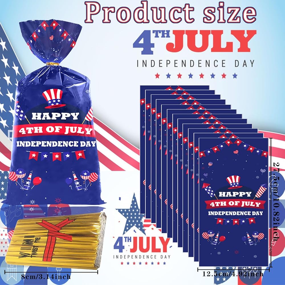100Pcs 4th of July Independence Day Patriotic Cellophane Gift Bags with Gold Twist Ties