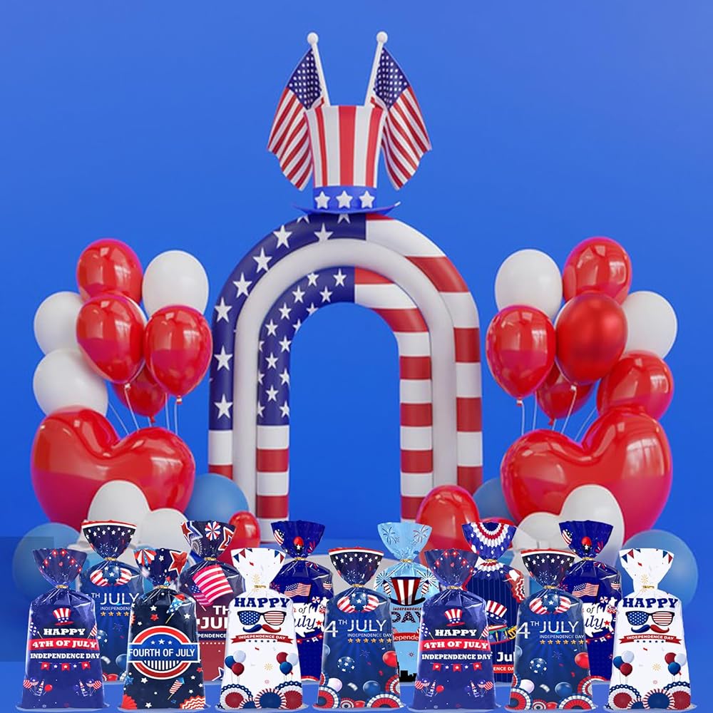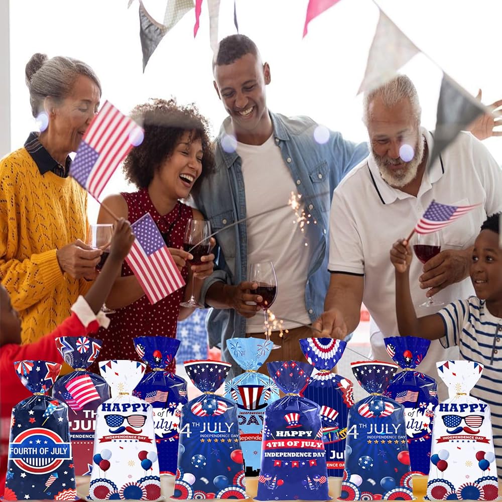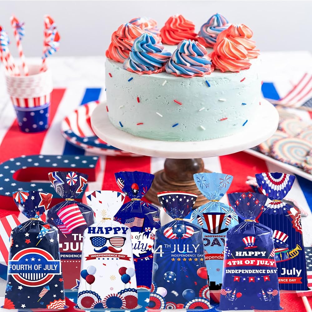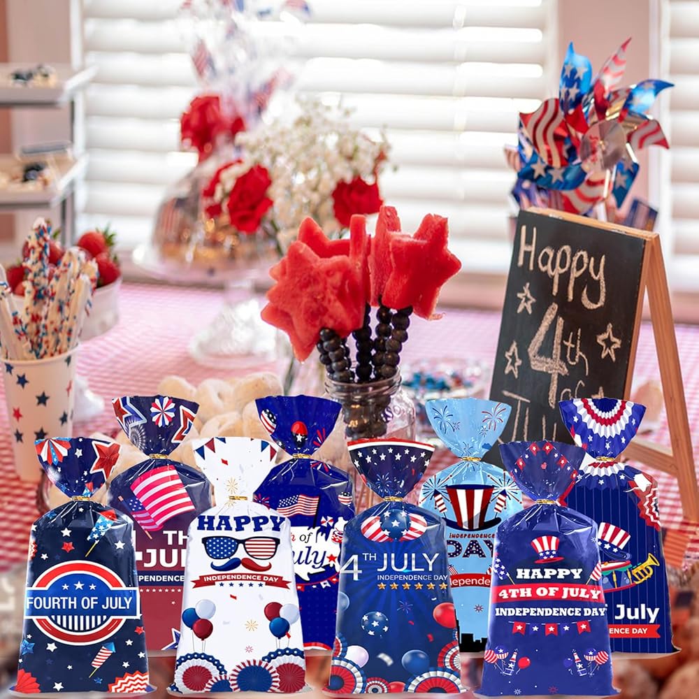 Package Includes: you will receive 100 pcs Independence Day theme cellophane bags mix in 8 different patterns, each bag comes double-sided printed beautiful patriotic style pattern, and come with 100 pcs gold twist ties, enough amount for your celebration activities party needs party food storage and gift decoration.
