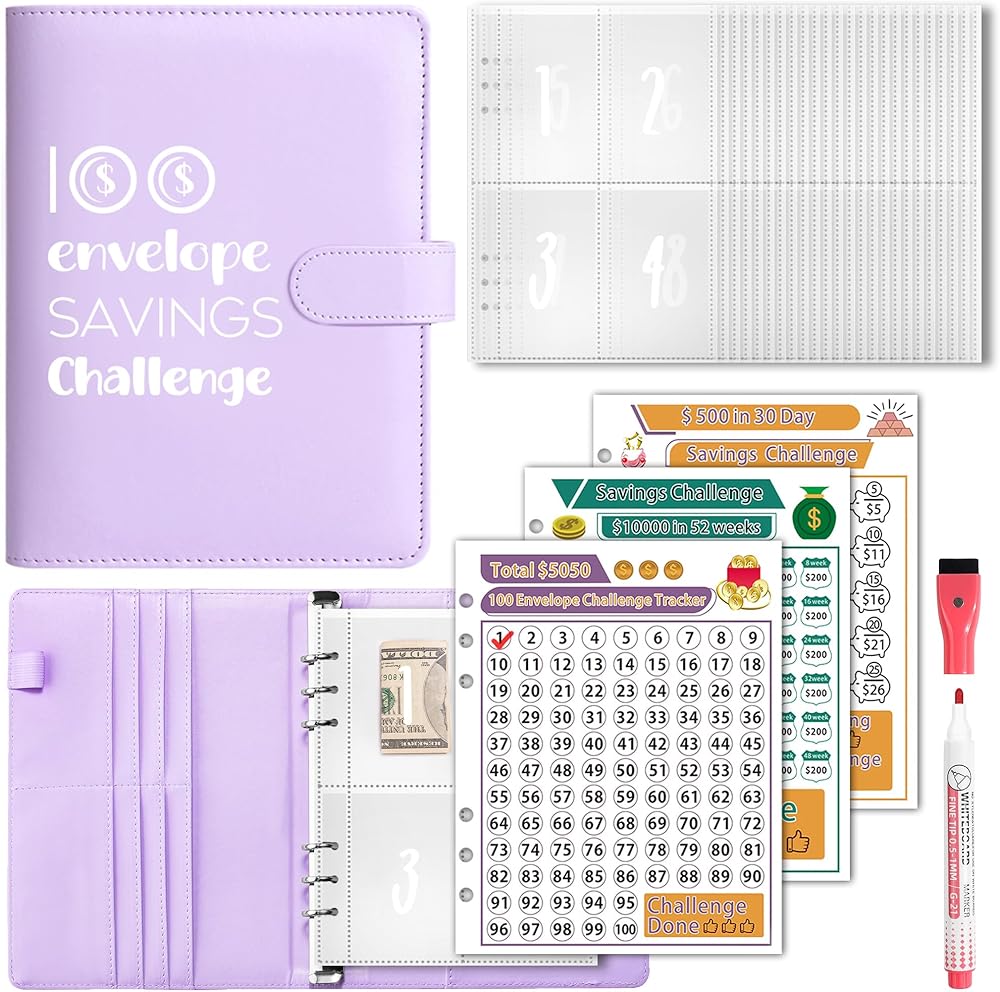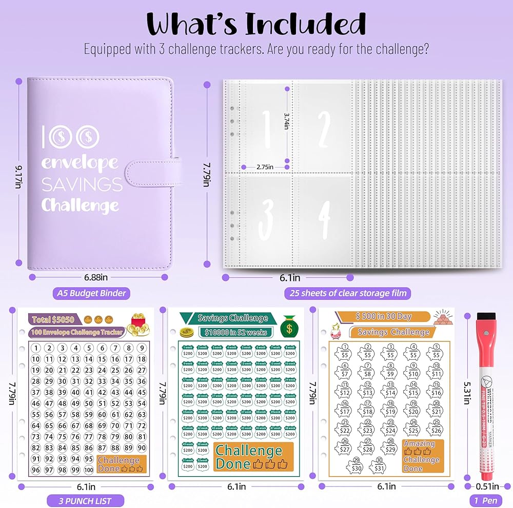 🎁All-in-One Kit for All Ages: You will get an A5 binder shell with card slots, 25 reusable transparent cash envelopes (Printed with numbers from 1-100), 3 erasable challenge tracker sheets for marking, and a whiteboard pen. No need to purchase additional accessories, perfect for personal use or gifting to kids, family, lovers, friends or colleagues in New Year, Valentine's Day, birthday, Children's Day, back to school and graduation.