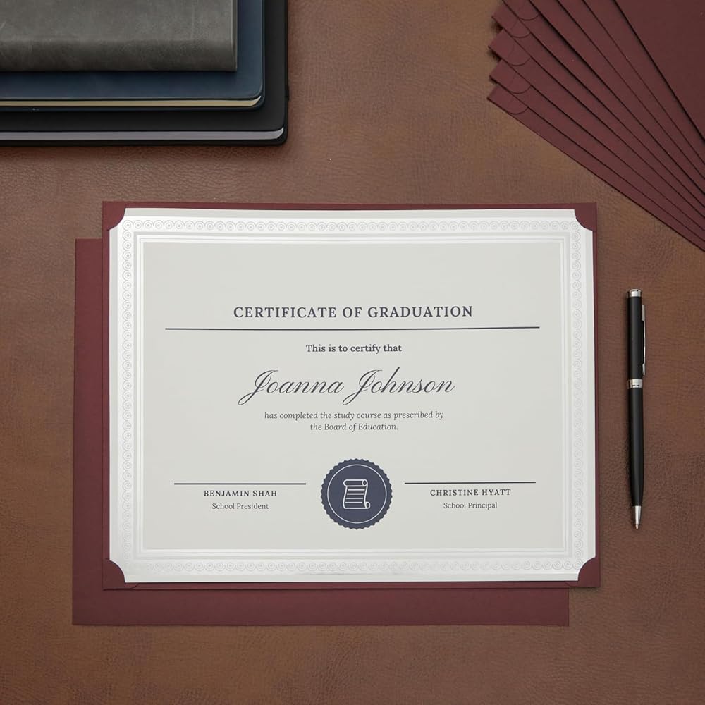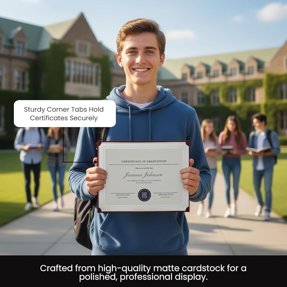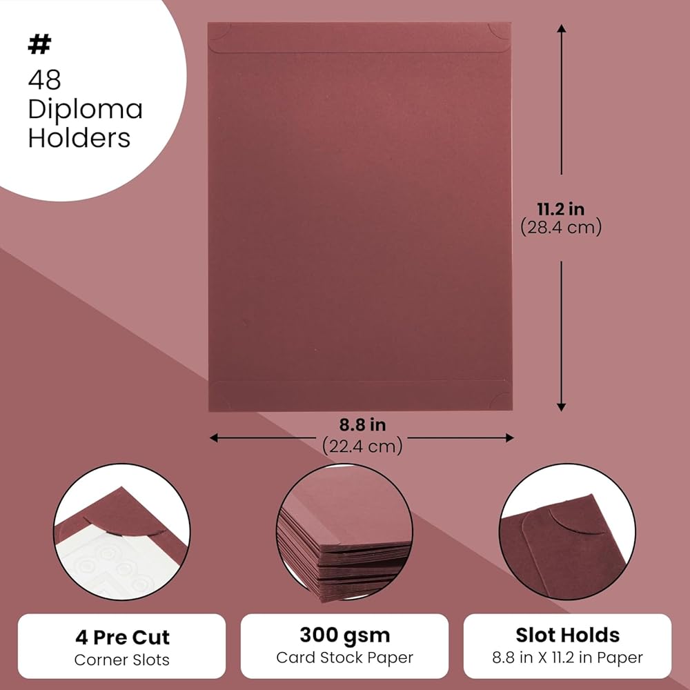 includes 24 certificate cover holders to present and protect prized award recognition certificates and important documents. The cover features stylish gold foil border designs and embellishments for a touch of elegance. Features four pre-cut corner slots to hold vertically or horizontally formatted letter-sized documents in place. Each certificate holder is made of heavyweight 300 GSM card stock. Dimensions: 11.25 x 8.8