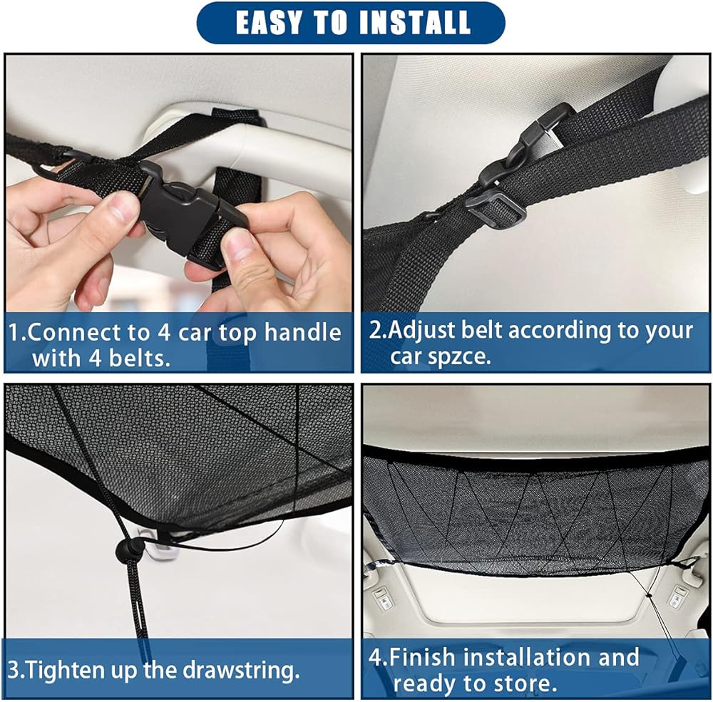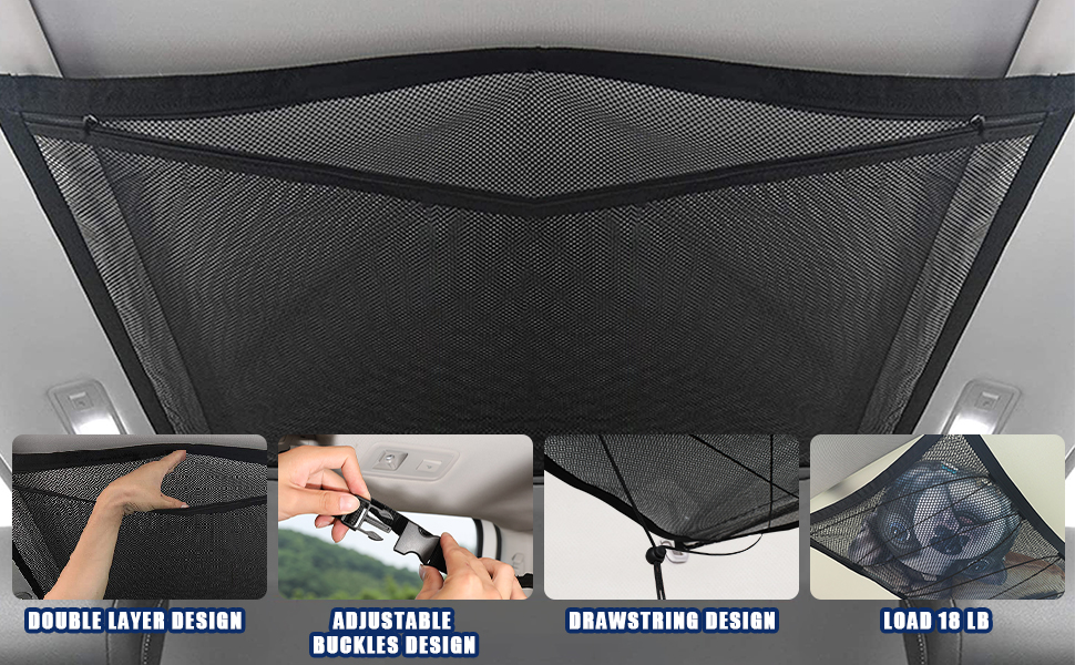 • 【عملية ومفيدة】 يبلغ قياس شبكة تخزين البضائع على السقف 35.5 × 25.6 بوصة أكبر من مقاسات أخرى 31 × 19 بوصة، مثالية للحفاظ على تنظيم السيارة وجميع أغراضك بعيدًا عن الأرض في متناول اليد، ويمكن تخزين الملابس والوسائد والبطانيات، الإلكترونيات والوجبات الخفيفة والمناشف الورقية. يستخدم كل مساحة السقف التي تمنع المقعد الخلفي والأرضية من الفوضى.