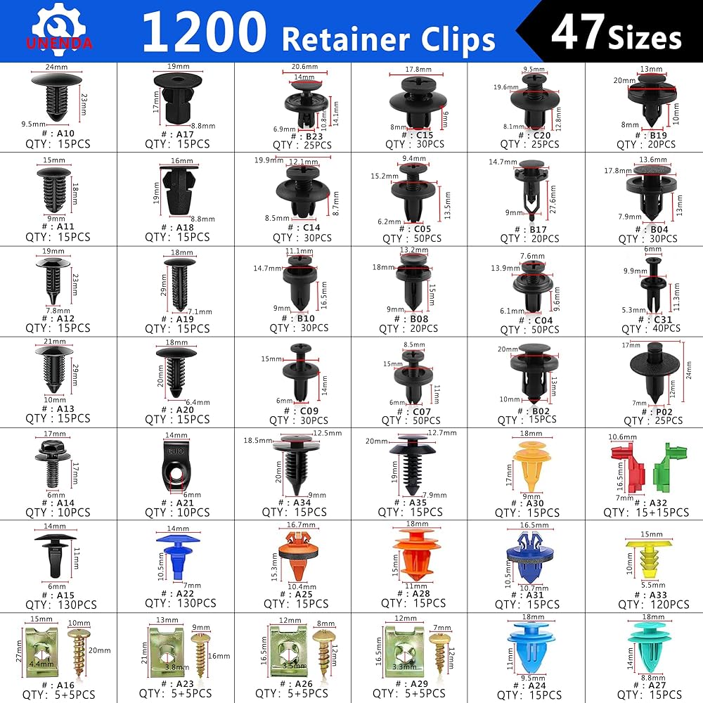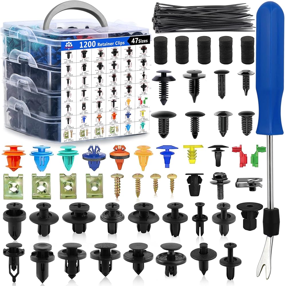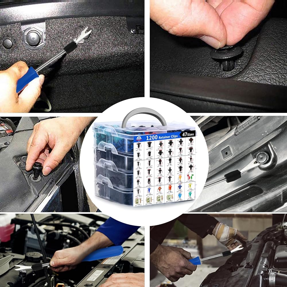 UNIVERSAL AUTOMOTIVE CLIPS KIT - 1430PCS great assortment push retainer kit including 47 most popular sizes, 4 different kinds tools with 1 Blue Fastener Remover, fitting for door trim, radiator shield yoke, fender, bumper, side skirt, grille, engine cover and splash shield retainers replacement,compatible with Ford, GM, Chrysler, Toyota, Honda and more.