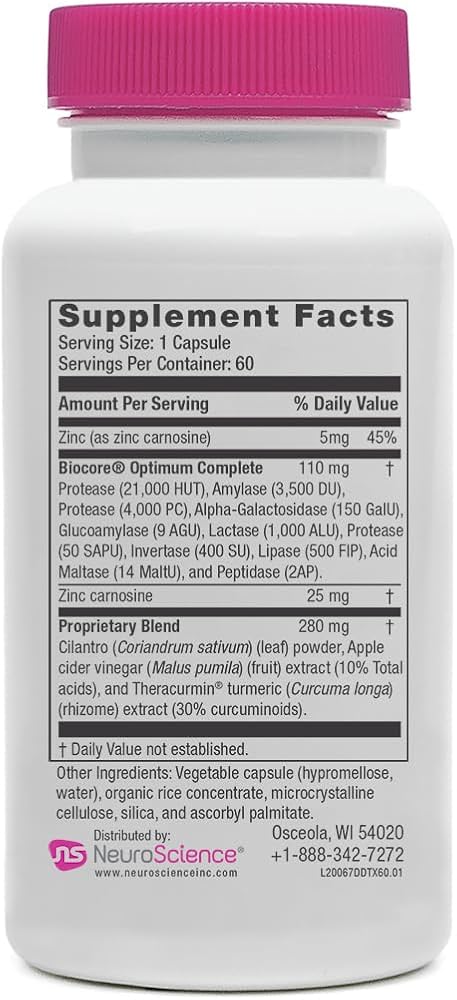 Formulated with digestive enzymes ( protease enzyme supplement ) and botanicals to break the toxin-induced immune cycle through improved digestive health, digestive support, aided detox cleanse mechanisms, healthy gut support, and balanced immune health and function. Digestive enzymes for women and men with apple cider vinegar, cilantro plant extract, and turmeric supplements ( turmeric curcumin ).* Features lipase, amylase enzyme and lactase enzyme.