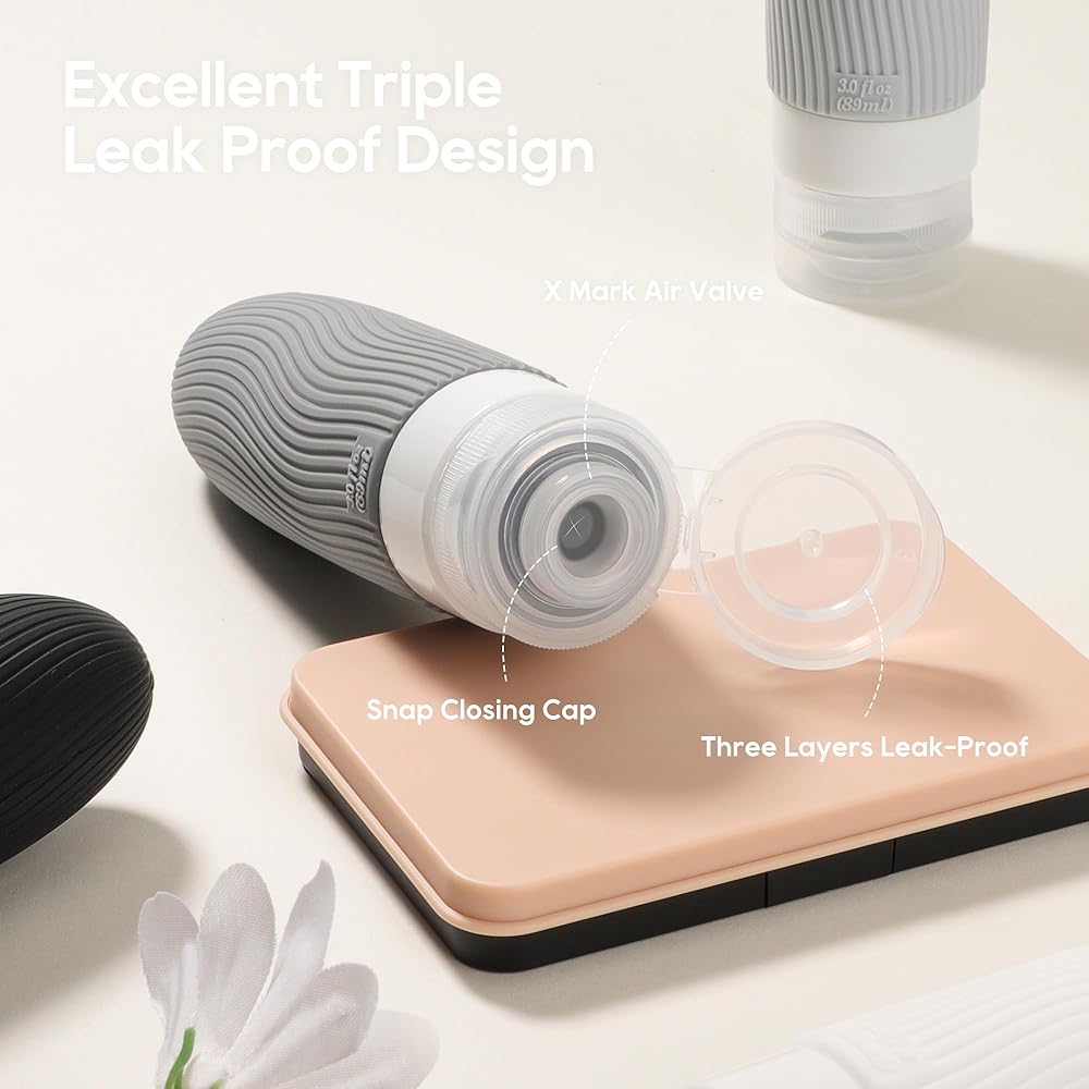 Leak Proof Travel Bottles - Designed to three-layer leak proof cap and no-drip valve to prevent liquid leakage or overflow, and is firmly sealed to prevent your luggage and clothes from messing by leaking liquid. Also the "X" valve help you always dispense just the right amount, help to reduce waste your expensive liquid toiletries.