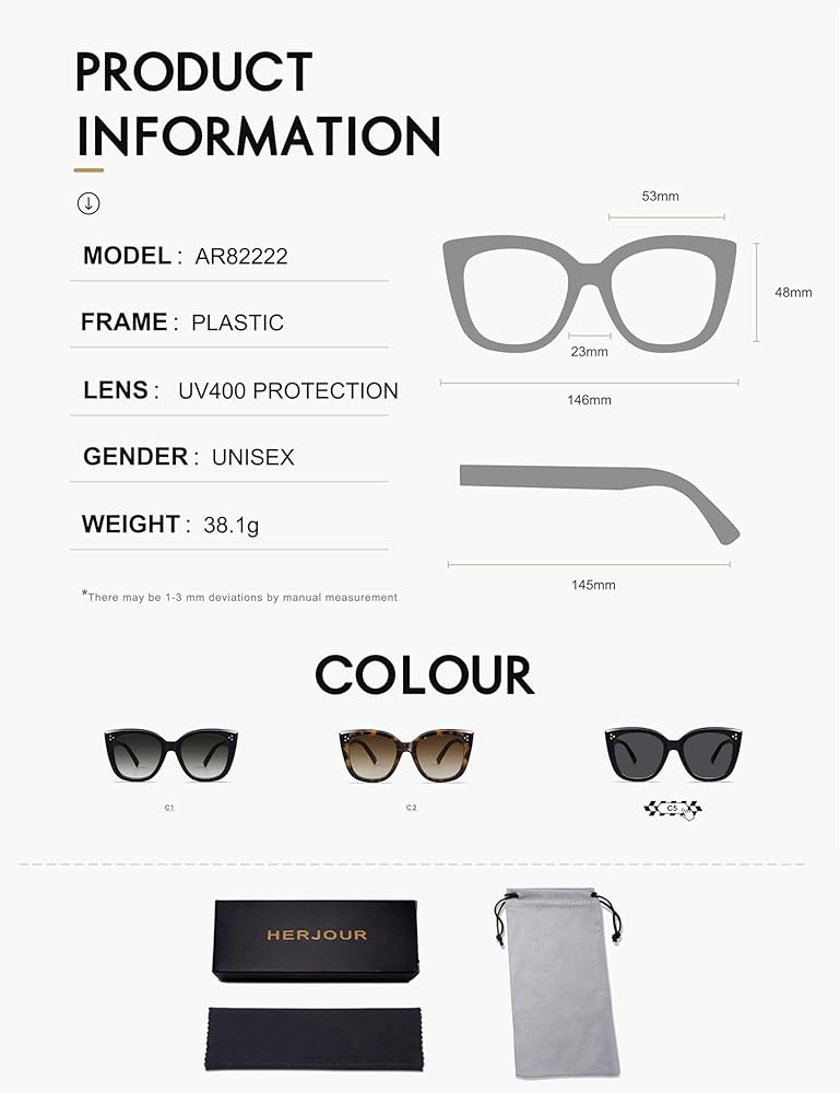 Products and services - Including Sunglasses*1, microfiber glasses cleaning cloth*1, glasses box*1.And all Allarallvr customers enjoy 30-Days refund and damage warranty,if you have any questions,please contact us for any time,we are expecting to serve you!