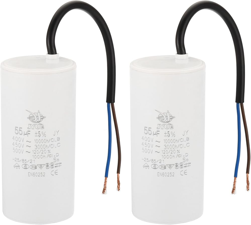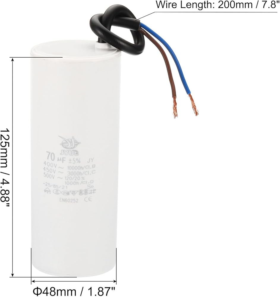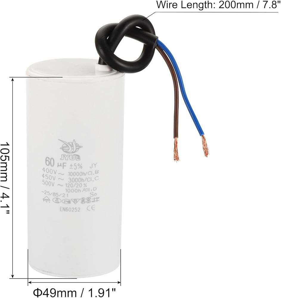 Model: CBB60; Material: Polypropylene Film Plastic Shell; Lead End: 2 Wires; Tolerance: ±5%; Rated Capacity: 55uf; Climatic Category: 25/85/21; Body Size: 105 x 48mm/4.1 x 1.87inch(H x D);Shell Color: White; Wire Length: 200mm/7.8inch;; Pack of 2Pcs Run Capacitor