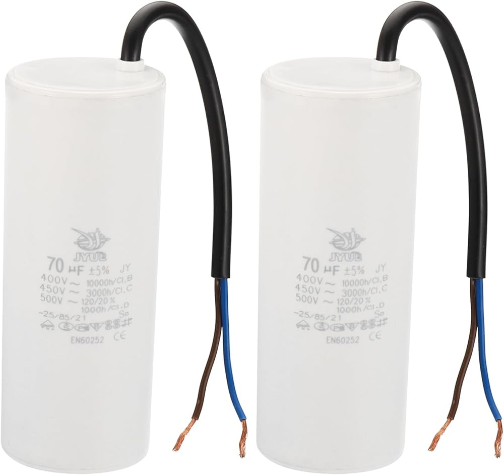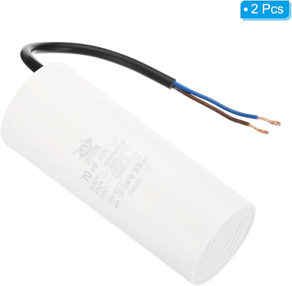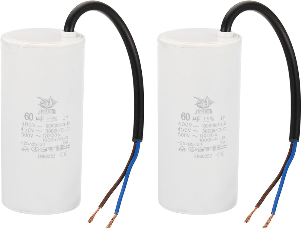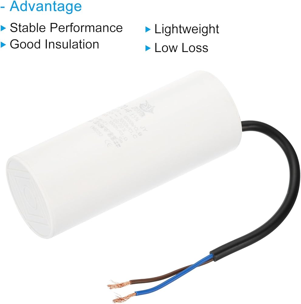Model: CBB60; Material: Polypropylene Film Plastic Shell; Lead End: 2 Wires; Tolerance: ±5%; Rated Capacity: 55uf; Climatic Category: 25/85/21; Body Size: 105 x 48mm/4.1 x 1.87inch(H x D);Shell Color: White; Wire Length: 200mm/7.8inch;; Pack of 2Pcs Run Capacitor