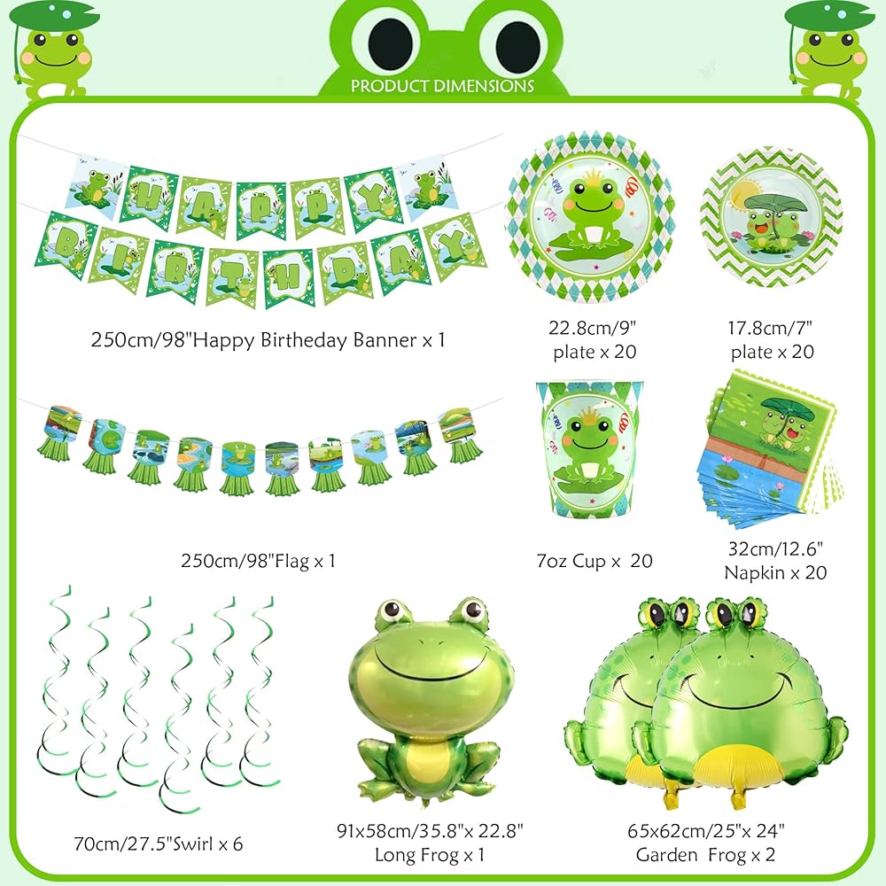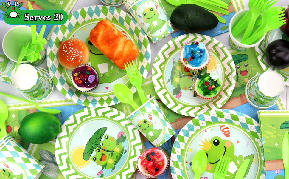 🐸Frog Birthday Party Supplies Includes: 20 large plates, 20 small plates, 20 frog paper cups, 20 frog tissues, 1pcs Tablecloth, 1 element banner, 1 HAPPY BIRTHDAY banner, 6x Swirl, 3 Frog Foil Balloons, 1 Cake Topper, 10 Cupcake Toppers, 18 latex balloon, 20 Spoons, 20 Fork, 20 Knife