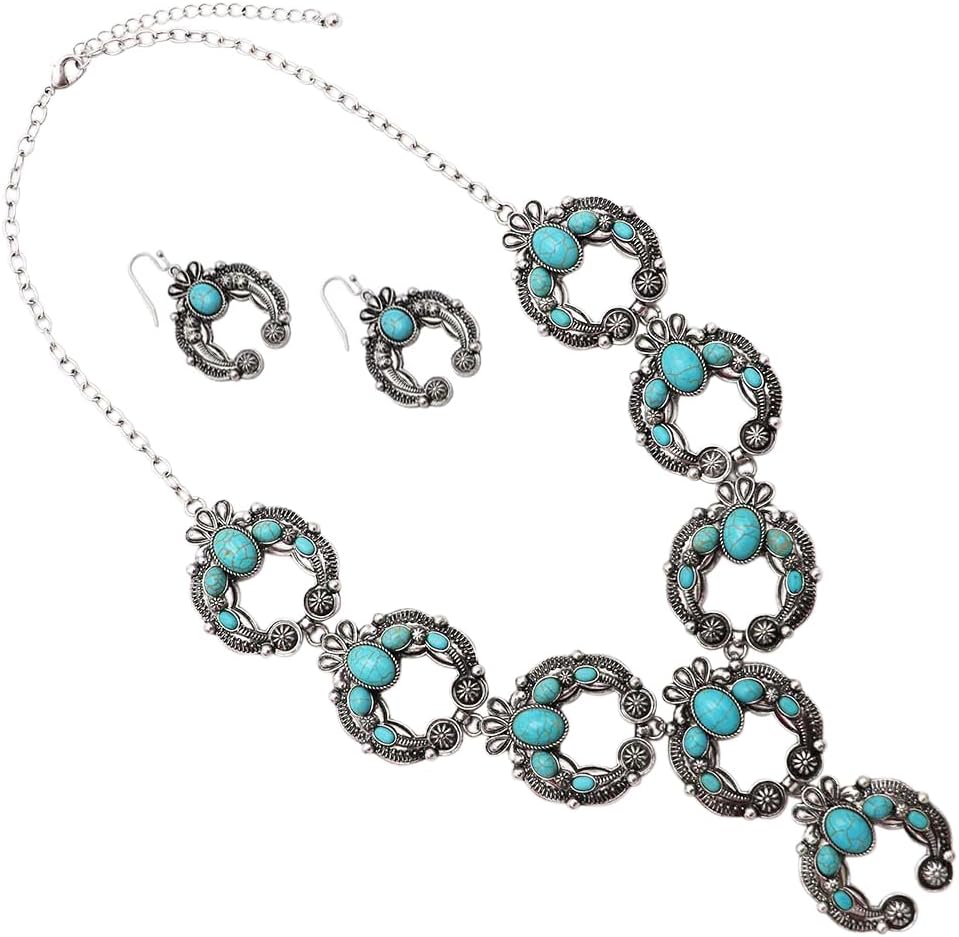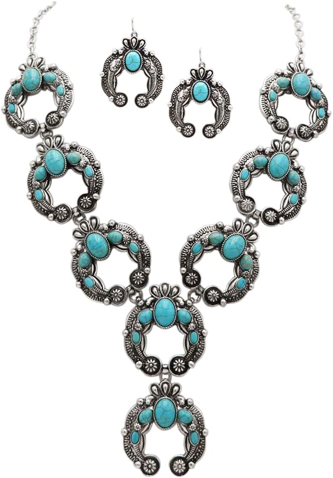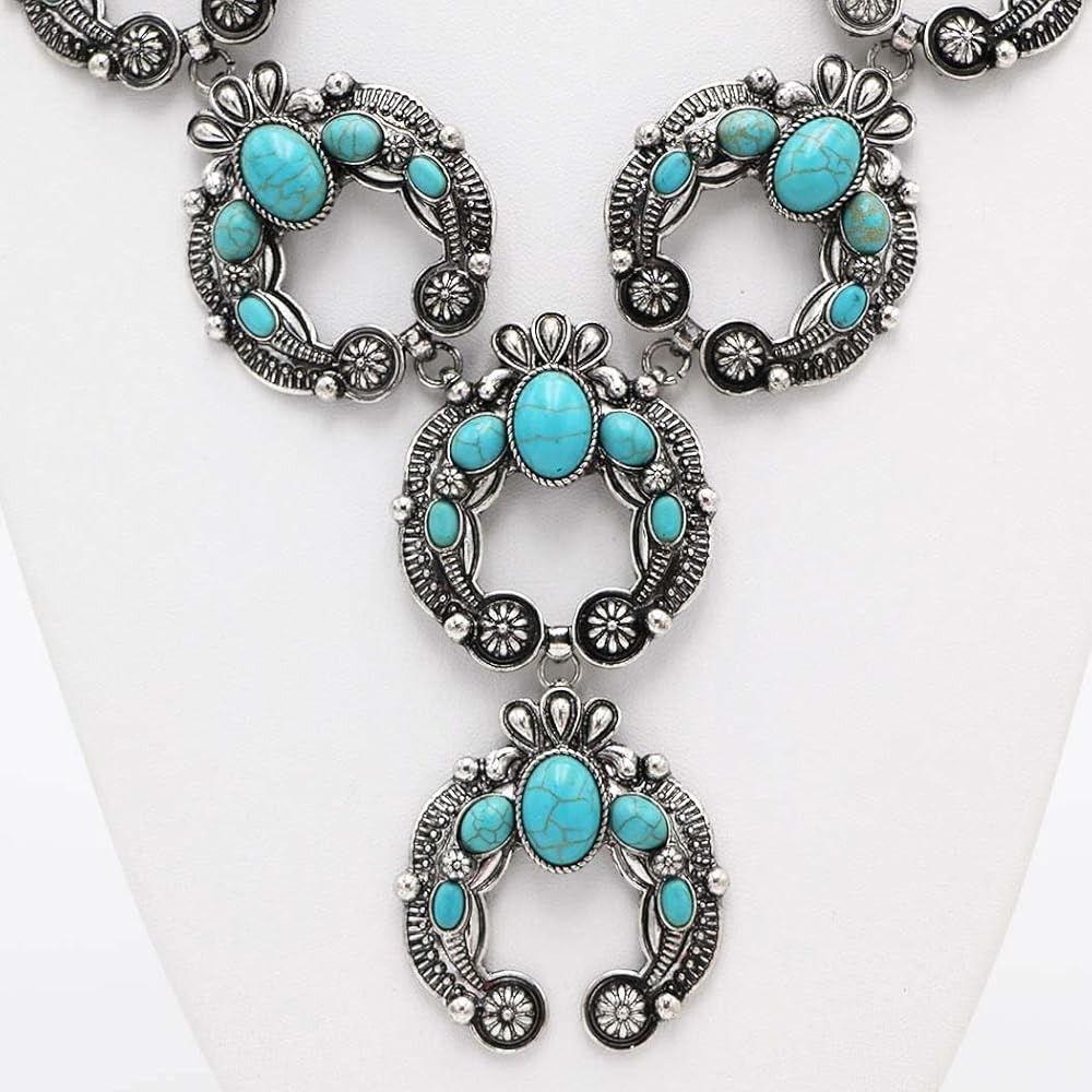 Bring some bold, dynamic style to your accessory collection! No western style wardrobe would be complete without at least one statement piece of howlite stone jewelry! Natural howlite stones and detailed engravings on the squash blossoms give this set an artisan touch. The squash blossom is inspired by Navajo symbolism, spiritual in nature, the crescent moon (naja) was said to ward off bad spirits and is a prototypical symbol of most notably the Navajo tribe.