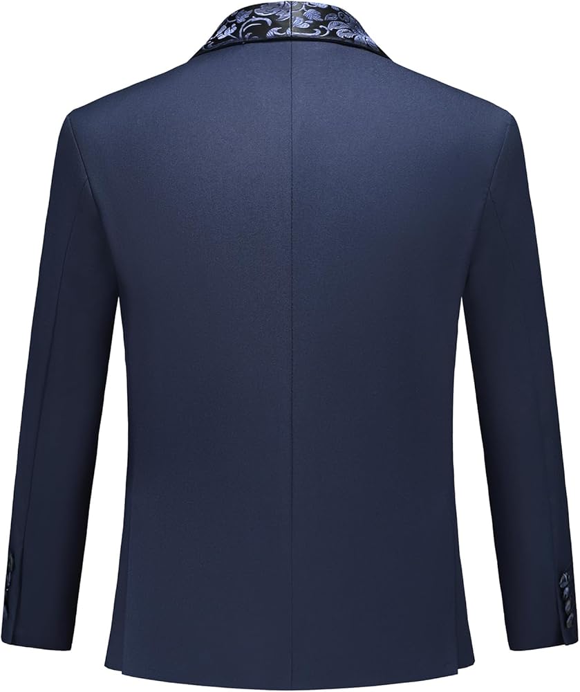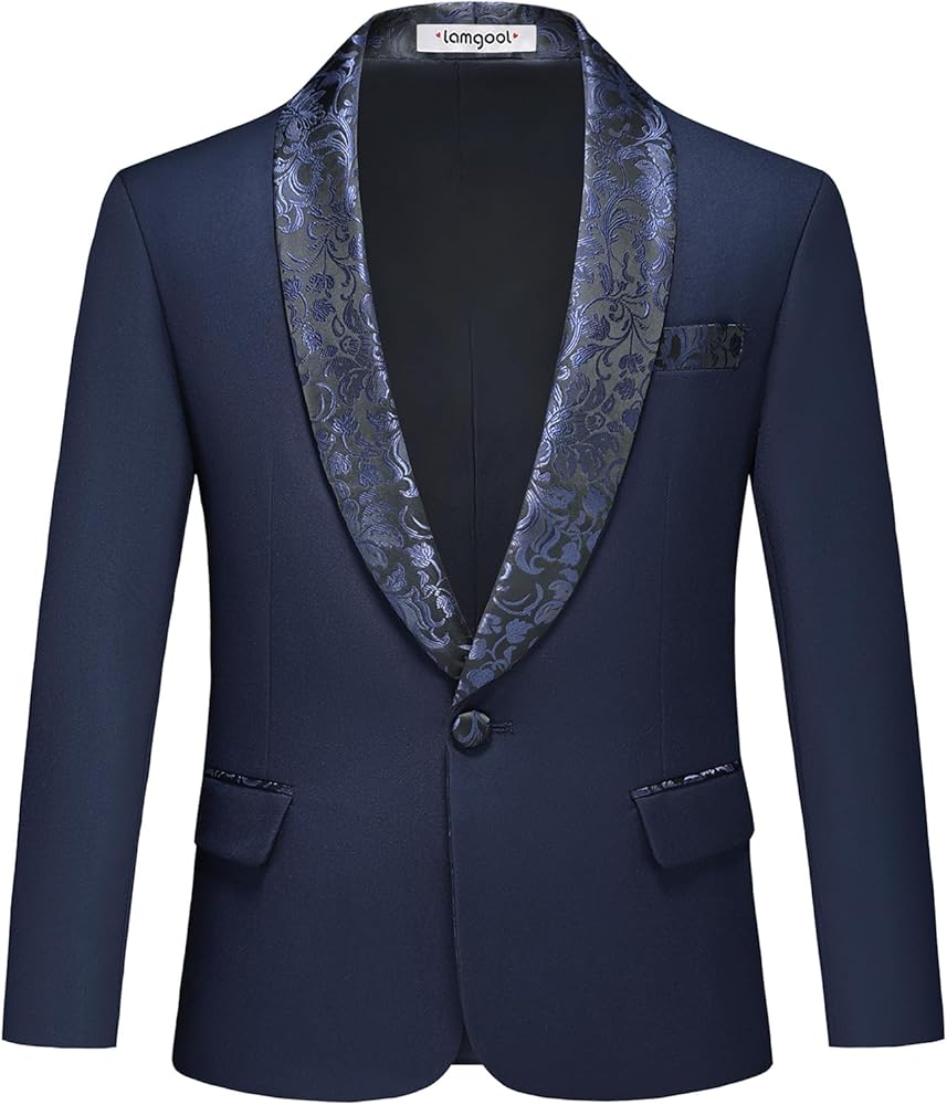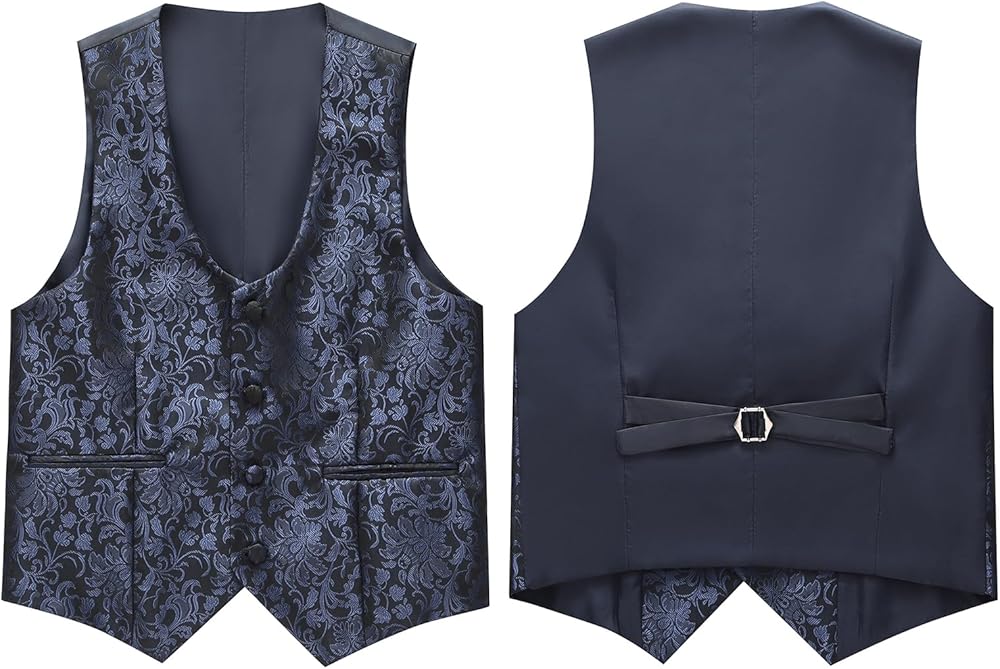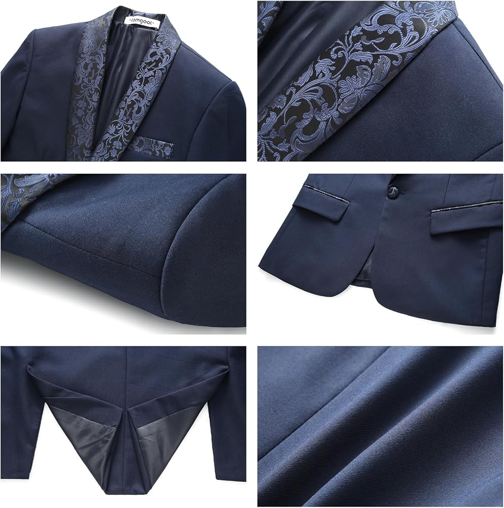 【EXQUISITE DESIGN】: This solid suit is paired with a beautifully jacquarded shawl lapel that adds style and personalization. Black, red, navy, and white kids tuxedo suits with jacquard flower patterns on the lapels for a more elegant look. Jacket includes 2 side flap pockets, 2 inside pockets, 1 chest pocket; Vest includes 2 side pockets; Pants includes 2 side pockets, 2 back pockets, functional pocket design provides convenience for active boys to carry small belongings