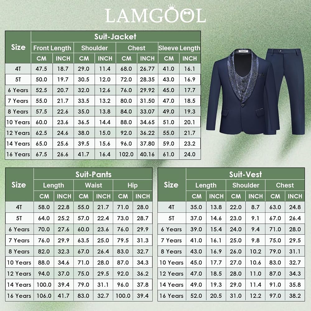 【3PCS SLIM FIT SUIT】: Our boy's 3-piece suit set includes a tuxedo jacket, vest and pants. We offer sizes from toddler suit 4t,5t,6t to boys suit size 7,8,10,12,14,16. Slim fit formal dress suit to fit most sized kids. Please check the size chart carefully before purchasing