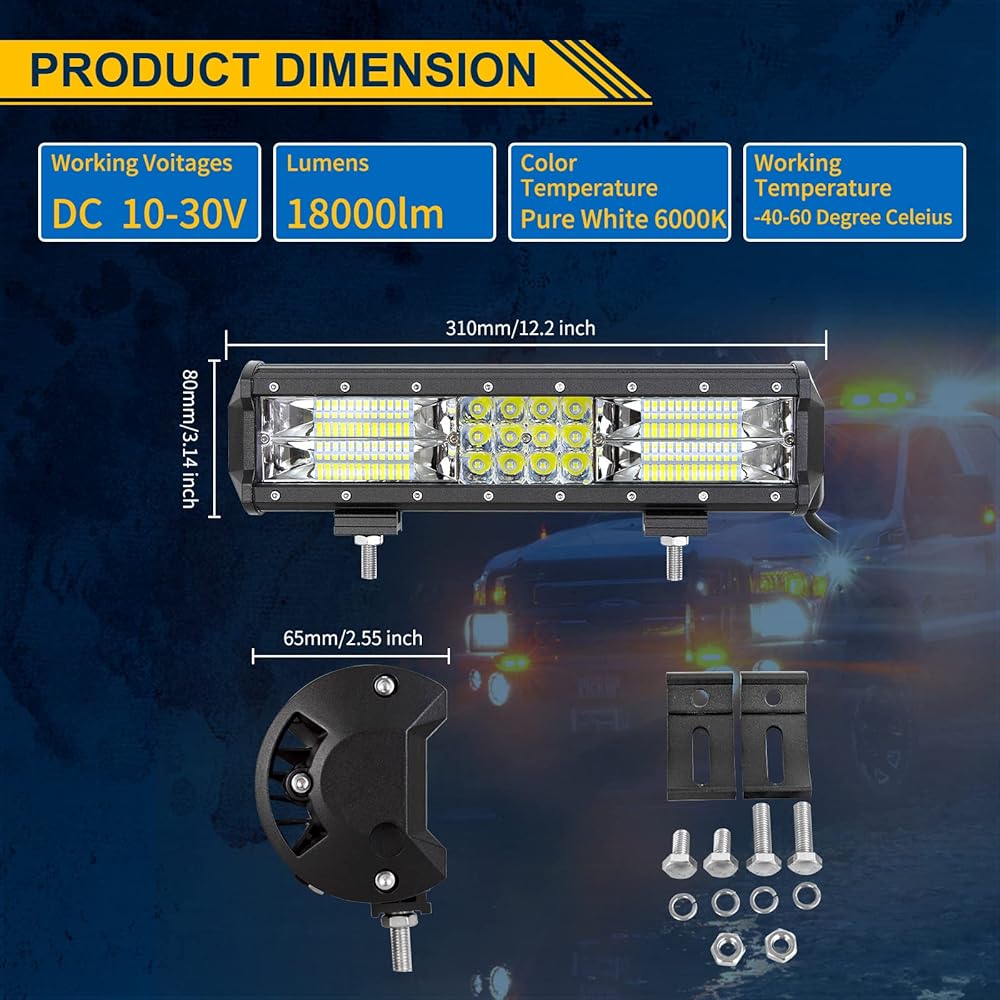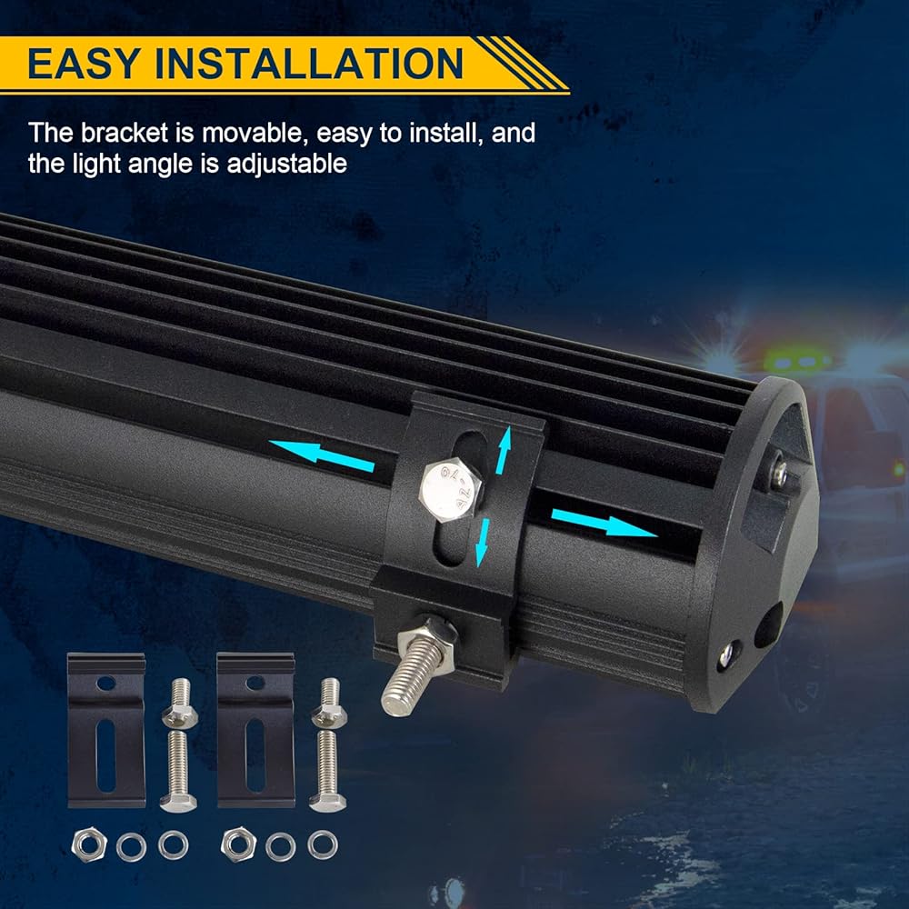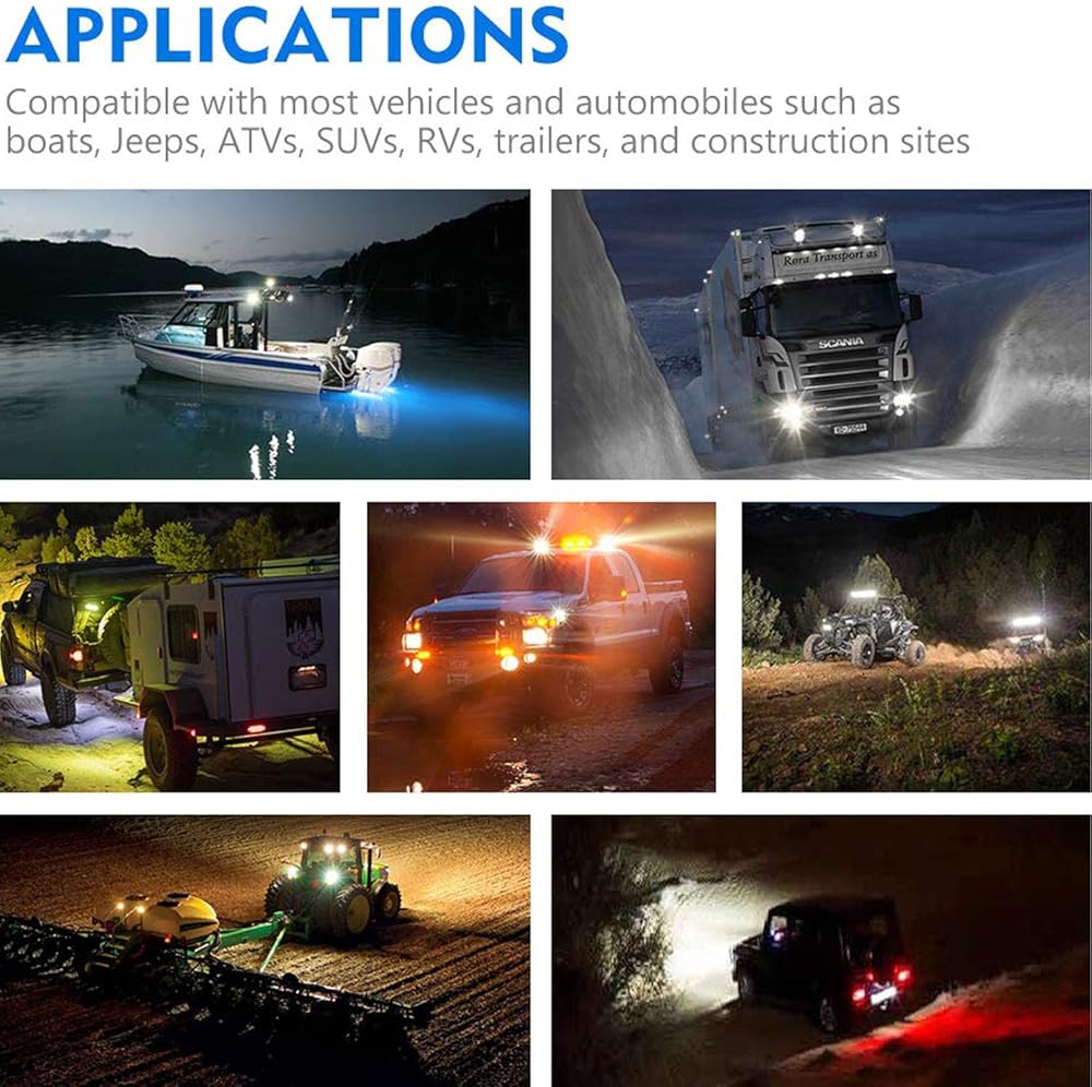DC 10V-30V operating voltage range: It can apply to different types of trucks, Off-road vehicles, 4x4 , SUV, Mining, Boating, Farming and Heavy Equipment etc. Also adjustable mounting brackets for multi-position installation, such as car roof, front cover, bumper, Grille, etc.