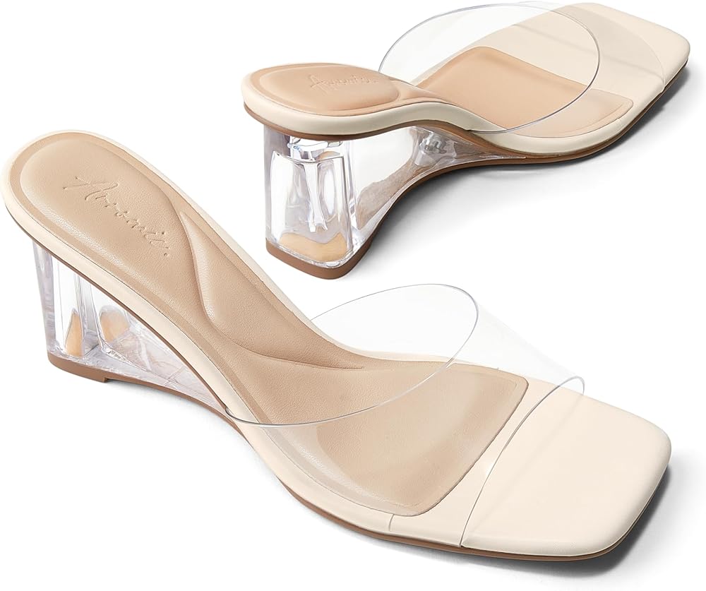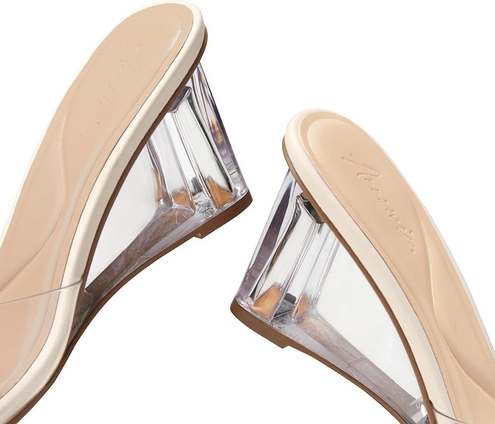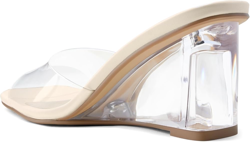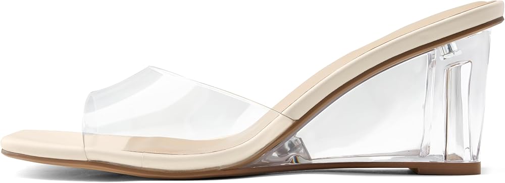 [3 Inch Clear Wedge Heels Sandals]:Half size UP would be highly advised for Wide Foot. Arromic clear wedge low heels feature for trendsetting flair: square toes and transparent wide strap, the heel height is about 3 inches.